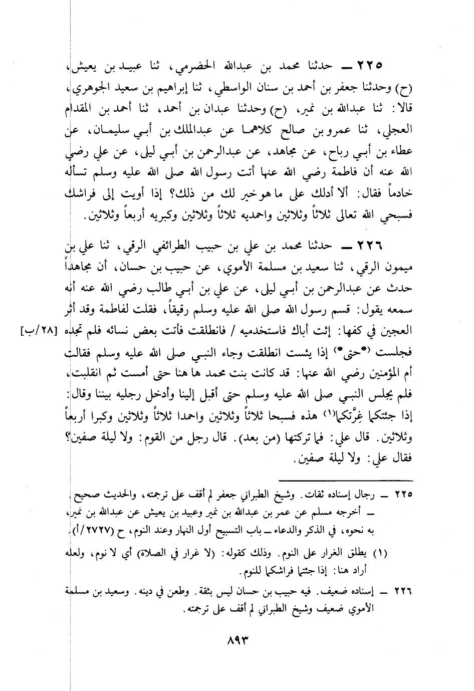 225- حَدَّثَنَا مُحَمَّدُ بْنُ عَبْدِ اللهِ الْحَضْرَمِيُّ، حَدَّثَنَا عُبَيْدُ بْنُ يَعِيشٍ (ح) وَحَدَّثَنَا جَعْفَرُ بْنُ أَحْمَدَ بْنِ سِنَانٍ الْوَاسِطِيُّ، حَدَّثَنَا إِبْرَاهِيمُ بْنُ سَعِيدٍ الْجَوْهَرِيُّ، قَالاَ: حَدَّثَنَا عَبْدُ اللهِ بْنُ نُمَيْرٍ (ح) وَحَدَّثَنَا عَبْدَانُ بْنُ أَحْمَدَ، حَدَّثَنَا أَحْمَدُ بْنُ الْمِقْدَامِ الْعِجْلِيُّ، حَدَّثَنَا عَمْرُو بْنُ صَالِحٍ، كِلاَهُمَا عَنْ عَبْدِ الْمَلِكِ بْنِ أَبِي سُلَيْمَانَ، عَنْ عَطَاءِ بْنِ أَبِي رَبَاحٍ، عَنْ مُجَاهِدٍ، عَنْ عَبْدِ الرَّحْمَنِ بْنِ أَبِي لَيْلَى، عَنْ عَلِيٍّ، رَضِيَ اللَّهُ عَنْهُ, أَنَّ فَاطِمَةَ، رَضِيَ اللَّهُ عَنْهَا أَتَتْ رَسُولَ اللهِ صَلى الله عَلَيه وَسَلم تَسْأَلُهُ خَادِمًا فَقَالَ: أَلاَ أَدُلُّكِ عَلَى مَا هُوَ خَيْرٌ لَكِ مِنْ ذَلِكَ؟ إِذَا أَوَيْتِ إِلَى فِرَاشِكِ فَسَبِّحِي اللَّهَ تَعَالَى ثَلاَثًا وَثَلاَثِينَ، وَاحْمَدِيهِ ثَلاَثًا وَثَلاَثِينَ، وَكَبِّرِيهِ أَرْبَعًا وَثَلاَثِينَ.