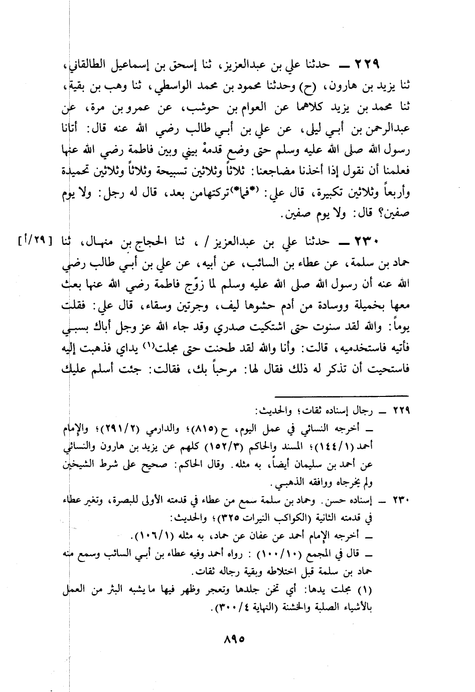 229- حَدَّثَنَا عَلِيُّ بْنُ عَبْدِ الْعَزِيزِ، حَدَّثَنَا إِسْحَاقُ بْنُ إِسْمَاعِيلَ الطَّالْقَانِيُّ، حَدَّثَنَا يَزِيدُ بْنُ هَارُونَ (ح) وَحَدَّثَنَا مَحْمُودُ بْنُ مُحَمَّدٍ الْوَاسِطِيُّ، حَدَّثَنَا وَهْبُ بْنُ بَقِيَّةَ، حَدَّثَنَا مُحَمَّدُ بْنُ يَزِيدَ، كِلاَهُمَا عَنِ الْعَوَّامِ بْنِ حَوْشَبٍ، عَنْ عَمْرِو بْنِ مُرَّةَ، عَنْ عَبْدِ الرَّحْمَنِ بْنِ أَبِي لَيْلَى، عَنْ عَلِيِّ بْنِ أَبِي طَالِبٍ، رَضِيَ اللَّهُ عَنْهُ قَالَ: أَتَانَا رَسُولُ اللهِ صَلى الله عَلَيه وَسَلم حَتَّى وَضَعَ قَدَمَهُ بَيْنِي وَبَيْنَ فَاطِمَةَ رَضِيَ اللَّهُ عَنْهَا فَعَلَّمَنَا أَنْ نَقُولَ إِذَا أَخَذْنَا مَضَاجِعَنَا ثَلاَثًا وَثَلاَثِينَ تَسْبِيحَةً وَثَلاَثًا وَثَلاَثِينَ تَحْمِيدَةً وَأَرْبَعًا وَثَلاَثِينَ تَكْبِيرَةً، قَالَ عَلِيٌّ: فَمَا تَرَكْتُهَا مِنْ بَعْدُ، قَالَ لَهُ رَجُلٌ: وَلاَ يَوْمَ صِفِّينَ؟ قَالَ: وَلاَ يَوْمَ صِفِّينَ.