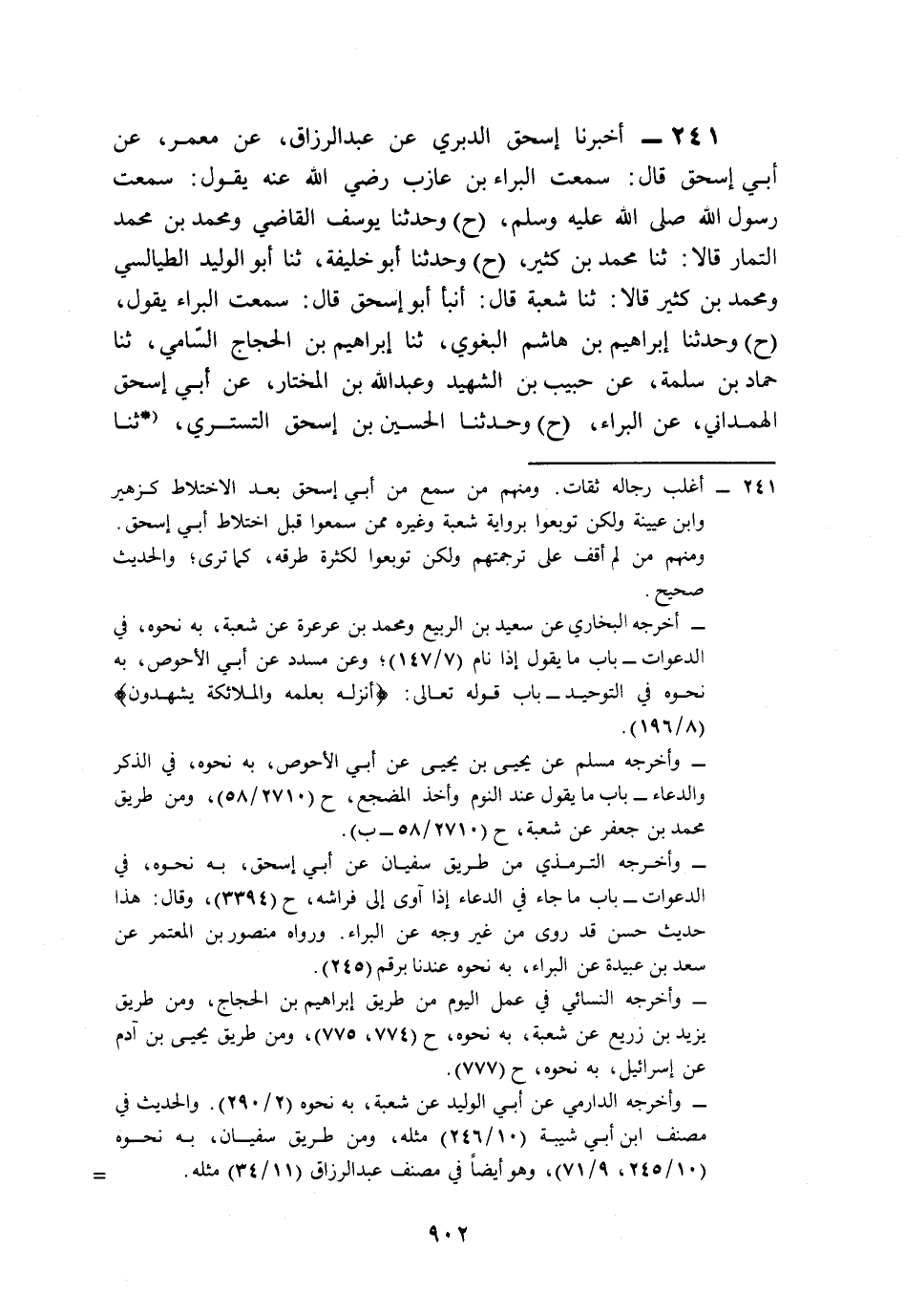 241- أَخْبَرَنَا إِسْحَاقُ الدَّبَرِيُّ، عَنْ عَبْدِ الرَّزَّاقِ، عَنْ مَعْمَرٍ، عَنْ أَبِي إِسْحَاقَ، قَالَ: سَمِعْتُ الْبَرَاءَ بْنَ عَازِبٍ، رَضِيَ اللَّهُ عَنْهُ يَقُولُ: سَمِعْتُ رَسُولَ اللهِ صَلى الله عَلَيه وَسَلم (ح) وَحَدَّثَنَا يُوسُفُ الْقَاضِي، وَمُحَمَّدُ بْنُ مُحَمَّدٍ التَّمَّارُ، قَالاَ: حَدَّثَنَا مُحَمَّدُ بْنُ كَثِيرٍ (ح) وَحَدَّثَنَا أَبُو خَلِيفَةَ، حَدَّثَنَا أَبُو الْوَلِيدِ الطَّيَالِسِيُّ، وَمُحَمَّدُ بْنُ كَثِيرٍ، قَالاَ: حَدَّثَنَا شُعْبَةُ، قَالَ: أَخْبَرَنَا أَبُو إِسْحَاقَ، قَالَ: سَمِعْتُ الْبَرَاءَ يَقُولُ: (ح) وَحَدَّثَنَا إِبْرَاهِيمُ بْنُ هَاشِمٍ الْبَغَوِيُّ، حَدَّثَنَا إِبْرَاهِيمُ بْنُ الْحَجَّاجِ السَّامِيُّ، حَدَّثَنَا حَمَّادُ بْنُ سَلَمَةَ، عَنْ حَبِيبِ بْنِ الشَّهِيدِ، وَعَبْدِ اللهِ بْنِ الْمُخْتَارِ، عَنْ أَبِي إِسْحَاقَ الْهَمْدَانِيِّ، عَنِ الْبَرَاءِ, (ح) وَحَدَّثَنَا الْحُسَيْنُ بْنُ إِسْحَاقَ التُّسْتَرِيُّ، حَدَّثَنَا إِسْحَاقُ بْنُ إِبْرَاهِيمَ الصَّوَّافُ،