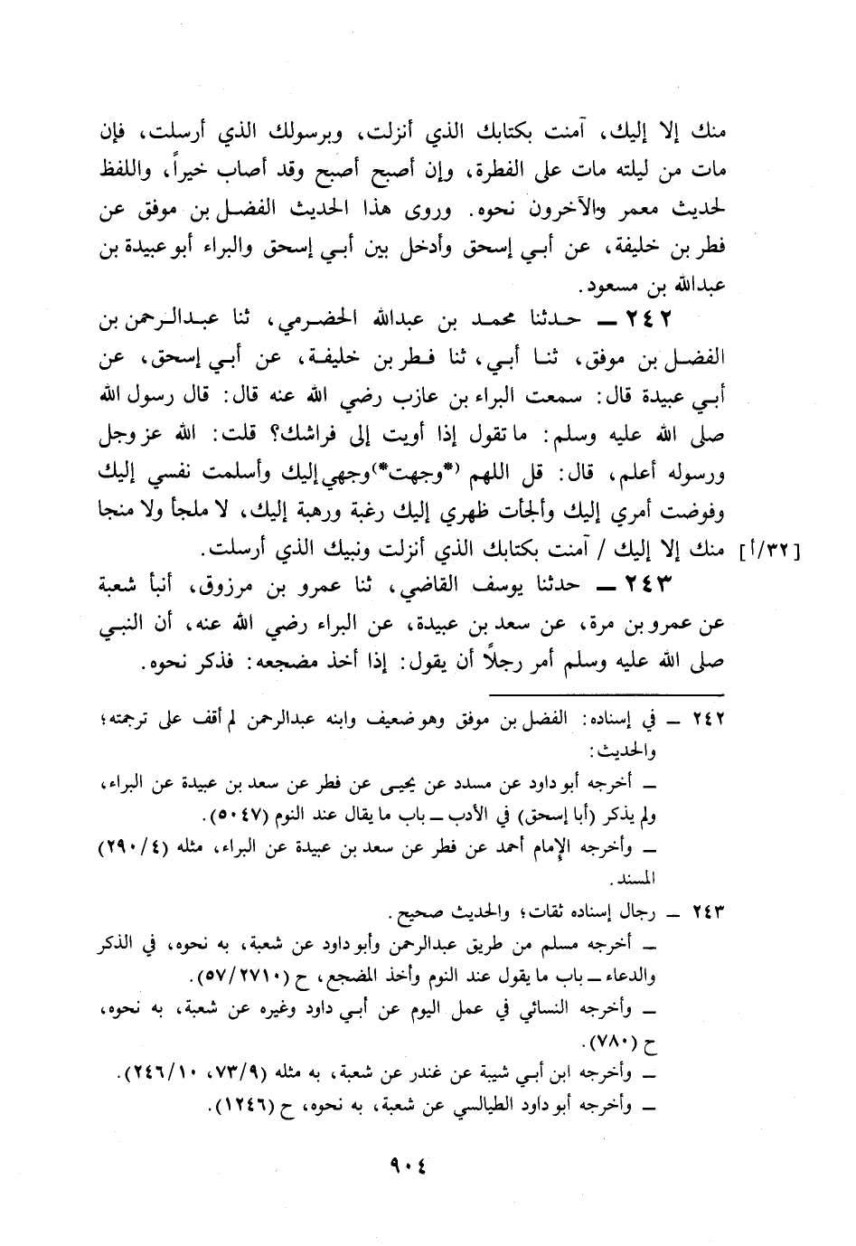 242- حَدَّثَنَا مُحَمَّدُ بْنُ عَبْدِ اللهِ الْحَضْرَمِيُّ، حَدَّثَنَا عَبْدُ الرَّحْمَنِ بْنُ الْفَضْلِ بْنِ مُوَفَّقٍ، حَدَّثَنَا أَبِي، حَدَّثَنَا فِطْرُ بْنُ خَلِيفَةَ، عَنْ أَبِي إِسْحَاقَ، عَنْ أَبِي عُبَيْدَةَ، قَالَ: سَمِعْتُ الْبَرَاءَ بْنَ عَازِبٍ، رَضِيَ اللَّهُ عَنْهُ قَالَ: قَالَ رَسُولُ اللهِ صَلى الله عَلَيه وَسَلم: مَا تَقُولُ إِذَا أَوَيْتَ إِلَى فِرَاشِكَ؟ قُلْتُ: اللَّهُ عَزَّ وَجَلَّ وَرَسُولُهُ أَعْلَمُ، قَالَ: قُلِ: اللَّهُمَّ وَجَّهْتُ وَجْهِي إِلَيْكَ، وَأَسْلَمْتُ نَفْسِي إِلَيْكَ، وَفَوَّضْتُ أَمْرِي إِلَيْكَ، وَأَلْجَأْتُ ظَهْرِي إِلَيْكَ، رَغْبَةً وَرَهْبَةً إِلَيْكَ، لاَ مَلْجَأَ وَلاَ مَنْجَا مِنْكَ إِلاَّ إِلَيْكَ، آمَنْتُ بِكِتَابِكَ الَّذِي أَنْزَلْتَ, وَنَبِيِّكَ الَّذِي أَرْسَلْتَ.