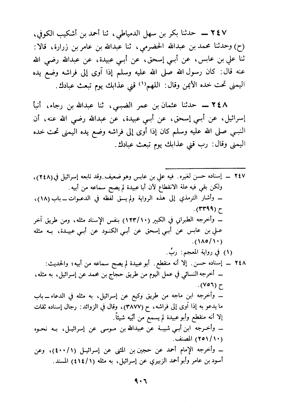 247- حَدَّثَنَا بَكْرُ بْنُ سَهْلٍ الدِّمْيَاطِيُّ، حَدَّثَنَا أَحْمَدُ بْنُ أَشْكِيبٍ الْكُوفِيُّ (ح) وَحَدَّثَنَا مُحَمَّدُ بْنُ عَبْدِ اللهِ الْحَضْرَمِيُّ، حَدَّثَنَا عَبْدُ اللهِ بْنُ عَامِرِ بْنِ زُرَارَةَ، قَالاَ: حَدَّثَنَا عَلِيُّ بْنُ عَابِسٍ، عَنْ أَبِي إِسْحَاقَ، عَنْ أَبِي عُبَيْدَةَ، عَنْ عَبْدِ اللهِ، رَضِيَ اللَّهُ عَنْهُ قَالَ: كَانَ رَسُولُ اللهِ صَلى الله عَلَيه وَسَلم إِذَا آوَى إِلَى فِرَاشِهِ, وَضَعَ يَدَهُ الْيُمْنَى تَحْتَ خَدِّهِ الأَيْمَنِ, وَقَالَ: اللَّهُمَّ قِنِي عَذَابَكَ يَوْمَ تَبْعَثُ عِبَادَكَ.