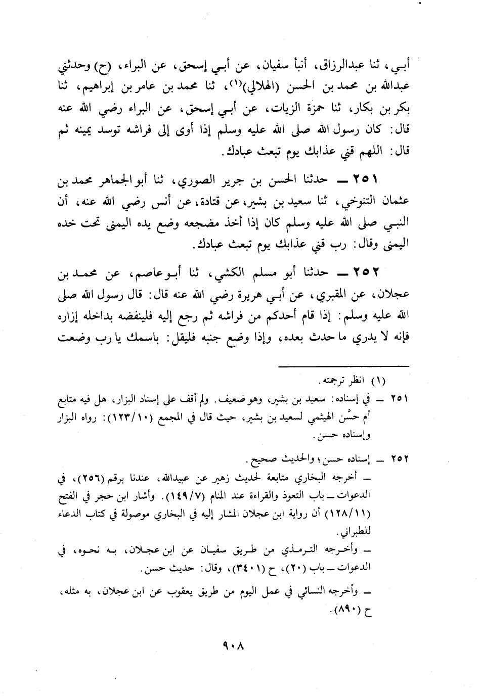 251- حَدَّثَنَا الْحَسَنُ بْنُ جَرِيرٍ الصُّورِيُّ، حَدَّثَنَا أَبُو الْجُمَاهِرِ مُحَمَّدُ بْنُ عُثْمَانَ التَّنُوخِيُّ، حَدَّثَنَا سَعِيدُ بْنُ بَشِيرٍ، عَنْ قَتَادَةَ، عَنْ أَنَسٍ، رَضِيَ اللَّهُ عَنْهُ, أَنَّ النَّبِيَّ صَلى الله عَلَيه وَسَلم كَانَ إِذَا أَخَذَ مَضْجَعَهُ وَضَعَ يَدَهُ الْيُمْنَى تَحْتَ خَدِّهِ الْيُمْنَى وَقَالَ: رَبِّ قِنِي عَذَابَكَ يَوْمَ تَبْعَثُ عِبَادَكَ.