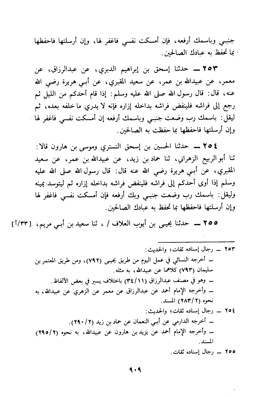 254- حَدَّثَنَا الْحُسَيْنُ بْنُ إِسْحَاقَ التُّسْتَرِيُّ، وَمُوسَى بْنُ هَارُونَ، قَالاَ: حَدَّثَنَا أَبُو الرَّبِيعِ الزَّهْرَانِيُّ، حَدَّثَنَا حَمَّادُ بْنُ زَيْدٍ، عَنْ عُبَيْدِ اللهِ بْنِ عُمَرَ، عَنْ سَعِيدٍ الْمَقْبُرِيِّ، عَنْ أَبِي هُرَيْرَةَ، رَضِيَ اللَّهُ عَنْهُ قَالَ: قَالَ رَسُولُ اللهِ صَلى الله عَلَيه وَسَلم: إِذَا أَوَى أَحَدُكُمْ إِلَى فِرَاشِهِ فَلْيَنْفُضْ فِرَاشَهُ بِدَاخِلَةِ إِزَارِهِ, ثُمَّ لِيَتَوَسَّدْ يَمِينَهُ وَلْيَقُلْ: بِاسْمِكَ رَبِّ وَضَعْتُ جَنْبِي وَبِكَ أَرْفَعُهُ، فَإِنْ أَمْسَكْتَ نَفْسِي فَاغْفِرْ لَهَا، وَإِنْ أَرْسَلْتَهَا فَاحْفَظْهَا, بِمَا تَحْفَظُ بِهِ عِبَادَكَ الصَّالِحِينَ.
