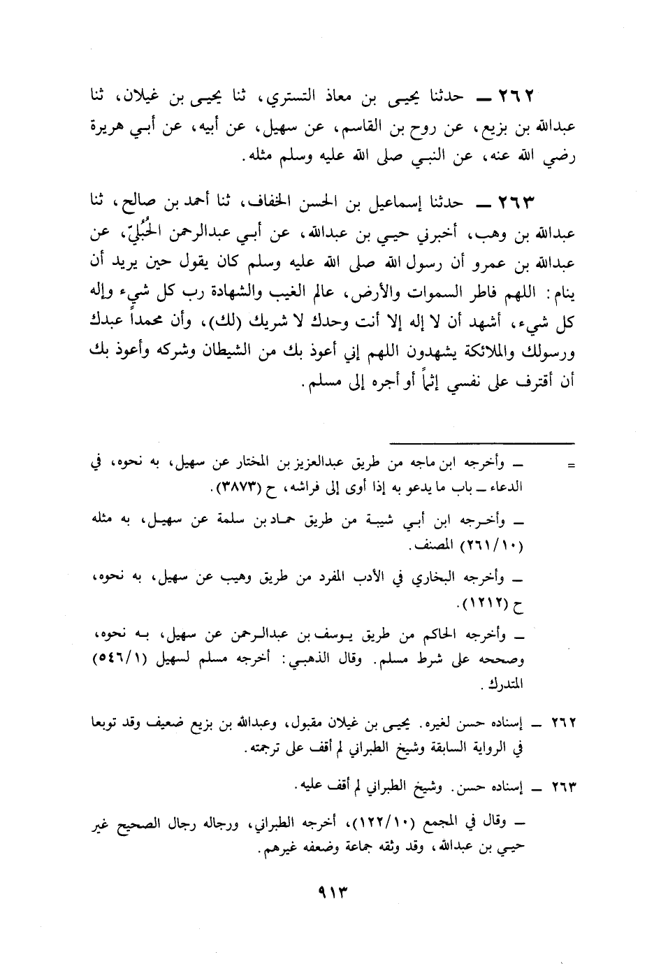 263- حَدَّثَنَا إِسْمَاعِيلُ بْنُ الْحَسَنِ الْخَفَّافُ، حَدَّثَنَا أَحْمَدُ بْنُ صَالِحٍ، حَدَّثَنَا عَبْدُ اللهِ بْنُ وَهْبٍ، أَخْبَرَنِي حُيَيُّ بْنُ عَبْدِ اللهِ، عَنْ أَبِي عَبْدِ الرَّحْمَنِ الْحُبُلِيِّ، عَنْ عَبْدِ اللهِ بْنِ عَمْرٍو، أَنَّ رَسُولَ اللهِ صَلى الله عَلَيه وَسَلم كَانَ يَقُولُ حِينَ يُرِيدُ أَنْ يَنَامَ: اللَّهُمَّ فَاطِرَ السَّمَاوَاتِ وَالأَرْضِ، عَالِمَ الْغَيْبِ وَالشَّهَادَةِ، رَبَّ كُلِّ شَيْءٍ، وَإِلَهَ كُلِّ شَيْءٍ، أَشْهَدُ أَنْ لاَ إِلَهَ إِلاَّ أَنْتَ، وَحْدَكَ لاَ شَرِيكَ لَكَ، وَأَنَّ مُحَمَّدًا عَبْدُكَ وَرَسُولُكَ, وَالْمَلاَئِكَةُ يَشْهَدُونَ، اللَّهُمَّ إِنِّي أَعُوذُ بِكَ مِنَ الشَّيْطَانِ وَشركِهِ، وَأَعُوذُ بِكَ أَنْ أَقْتَرِفَ عَلَى نَفْسِي إِثْمًا, أَوْ أَجُرُّهُ إِلَى مُسْلِمٍ.
