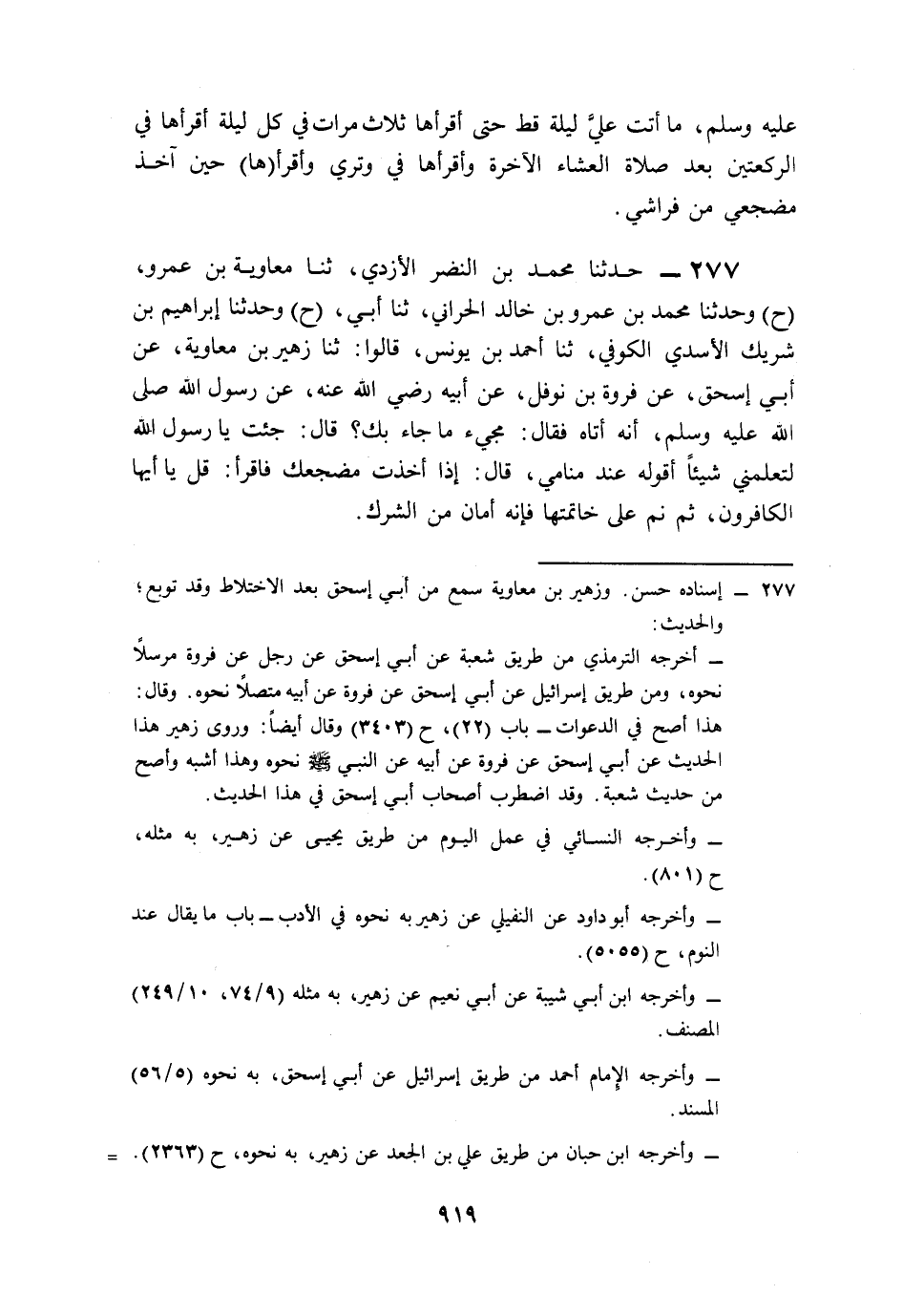 277- حَدَّثَنَا مُحَمَّدُ بْنُ النَّضْرِ الأَزْدِيُّ، حَدَّثَنَا مُعَاوِيَةُ بْنُ عَمْرٍو (ح) وَحَدَّثَنَا مُحَمَّدُ بْنُ عَمْرِو بْنِ خَالِدٍ الْحَرَّانِيُّ، حَدَّثَنَا أَبِي (ح) وَحَدَّثَنَا إِبْرَاهِيمُ بْنُ شَرِيكٍ الأَسَدِيُّ الْكُوفِيُّ، حَدَّثَنَا أَحْمَدُ بْنُ يُونُسَ، قَالُوا: حَدَّثَنَا زُهَيْرُ بْنُ مُعَاوِيَةَ، عَنْ أَبِي إِسْحَاقَ، عَنْ فَرْوَةَ بْنِ نَوْفَلٍ، عَنْ أَبِيهِ، رَضِيَ اللَّهُ عَنْهُ, عَنْ رَسُولِ اللهِ صَلى الله عَلَيه وَسَلم, أَنَّهُ أَتَاهُ فَقَالَ: مَجِيءٌ مَا جَاءَ بِكَ؟ قَالَ: جِئْتُ يَا رَسُولَ اللهِ لِتُعَلِّمَنِي شَيْئًا أَقُولُهُ عِنْدَ مَنَامِي، قَالَ: إِذَا أَخَذْتَ مَضْجَعَكَ فَاقْرَأْ: {قُلْ يَا أَيُّهَا الْكَافِرُونَ} ثُمَّ نَمْ عَلَى خَاتِمَتِهَا, فَإِنَّهُ أَمَانٌ مِنَ الشِّرْكِ.