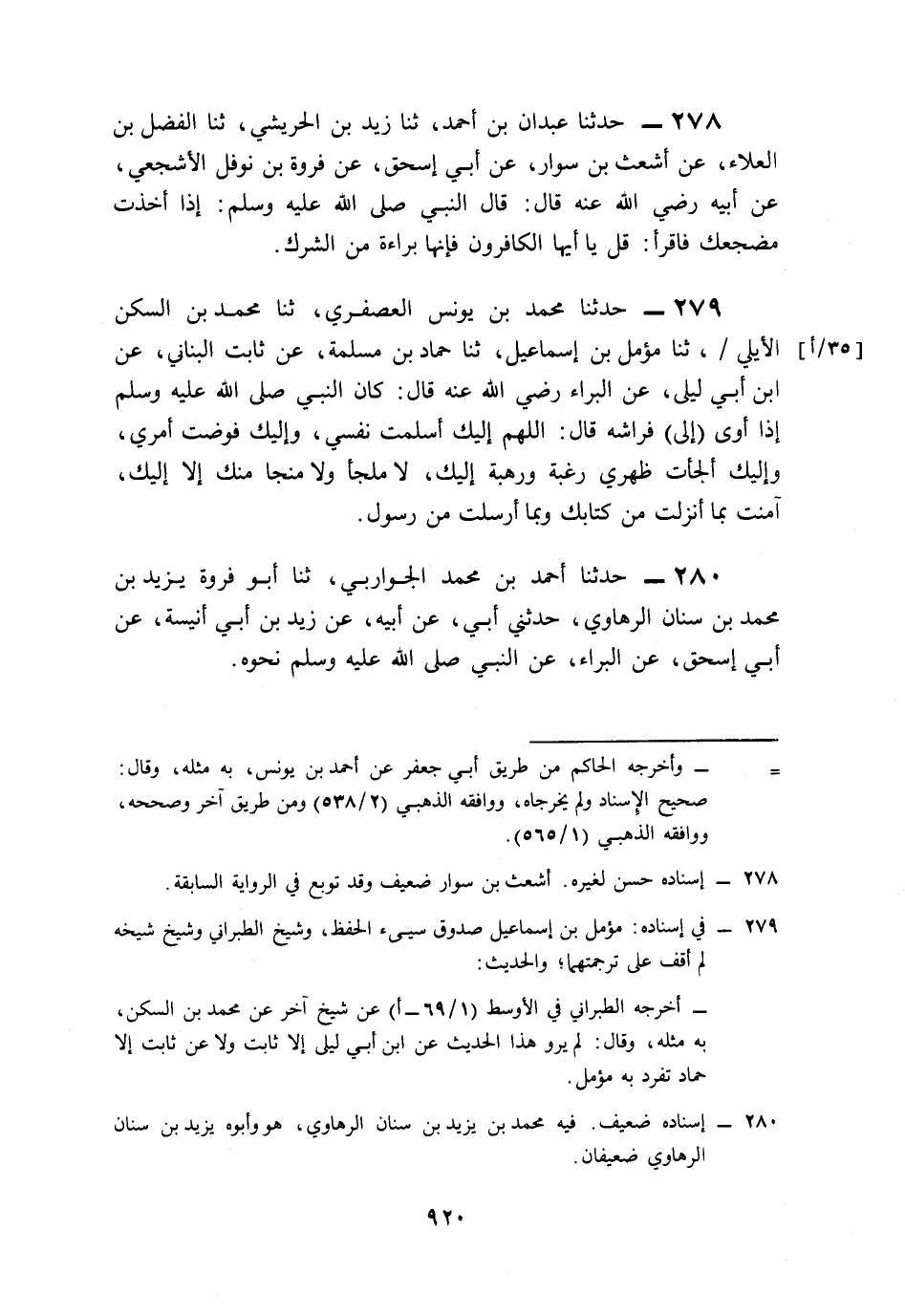 279- حَدَّثَنَا مُحَمَّدُ بْنُ يُونُسَ الْعُصْفُرِيُّ، حَدَّثَنَا مُحَمَّدُ بْنُ السَّكَنٍ الأَيْلِيُّ، حَدَّثَنَا مُؤَمَّلُ بْنُ إِسْمَاعِيلَ، حَدَّثَنَا حَمَّادُ بْنُ سَلَمَةَ (1) ، عَنْ ثَابِتٍ الْبُنَانِيِّ، عَنِ ابْنِ أَبِي لَيْلَى، عَنِ الْبَرَاءِ، رَضِيَ اللَّهُ عَنْهُ قَالَ: كَانَ النَّبِيُّ صَلى الله عَلَيه وَسَلم إِذَا أَوَى إِلَى فِرَاشِهِ قَالَ: اللَّهُمَّ إِلَيْكَ أَسْلَمْتُ نَفْسِي، وَإِلَيْكَ فَوَّضْتُ أَمْرِي، وَإِلَيْكَ أَلْجَأْتُ ظَهْرِي، رَغْبَةً وَرَهْبَةً إِلَيْكَ، لاَ مَلْجَأَ وَلاَ مَنْجَا مِنْكَ إِلاَّ إِلَيْكَ، آمَنْتُ بِمَا أَنْزَلْتَ مِنْ كِتَابِكَ، وَبِمَا أَرْسَلْتَ مِنْ رَسُولٍ.
