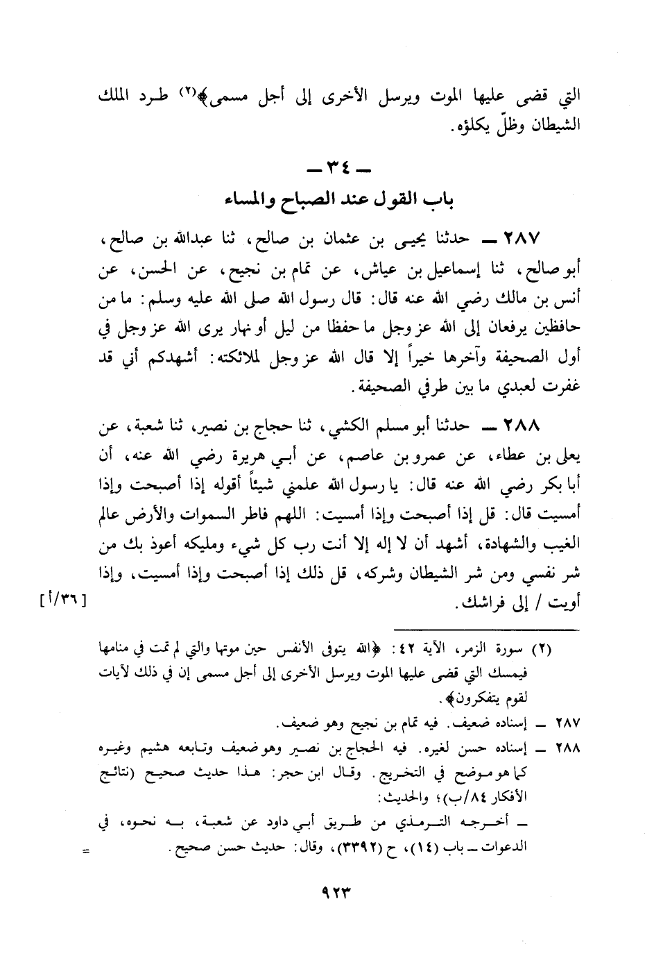 34- بَابُ الْقَوْلِ عِنْدَ الصَّبَّاحِ وَالْمَسَاءِ.