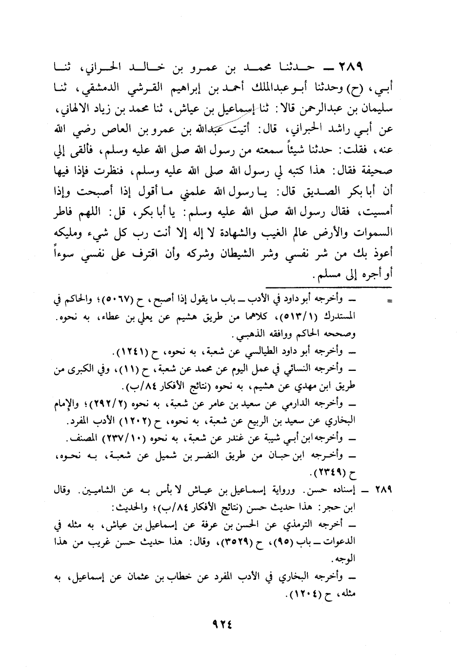289- حَدَّثَنَا مُحَمَّدُ بْنُ عَمْرِو بْنِ خَالِدٍ الْحَرَّانِيُّ، حَدَّثَنَا أَبِي (ح) وَحَدَّثَنَا أَبُو عَبْدِ الْمَلِكِ أَحْمَدُ بْنُ إِبْرَاهِيمَ الْقُرَشِيُّ الدِّمَشْقِيُّ، حَدَّثَنَا سُلَيْمَانُ بْنُ عَبْدِ الرَّحْمَنِ، قَالاَ: حَدَّثَنَا إِسْمَاعِيلُ بْنُ عَيَّاشٍ، حَدَّثَنَا مُحَمَّدُ بْنُ زِيَادٍ الأَلْهَانِيُّ، عَنْ أَبِي رَاشِدٍ الْحُبْرَانِيِّ، قَالَ: أَتَيْتُ عَبْدَ اللهِ بْنَ عَمْرِو بْنِ الْعَاصِ رَضِيَ اللَّهُ عَنْهُ فَقُلْتُ: حَدِّثْنَا شَيْئًا سَمِعْتَهُ مِنْ رَسُولِ اللهِ صَلى الله عَلَيه وَسَلم، فَأَلْقَى إِلَيَّ صَحِيفَةً, فَقَالَ: هَذَا كَتَبَهُ لِي رَسُولُ اللهِ صَلى الله عَلَيه وَسَلم, فَنَظَرْتُ, فَإِذَا فِيهَا: أَنَّ أَبَا بَكْرٍ الصِّدِّيقُ قَالَ: يَا رَسُولَ اللهِ, عَلِّمْنِي مَا أَقُولُ إِذَا أَصْبَحْتُ وَإِذَا أَمْسَيْتُ, فَقَالَ رَسُولُ اللهِ صَلى الله عَلَيه وَسَلم: يَا أَبَا بَكْرٍ, قُلِ: اللَّهُمَّ فَاطِرَ السَّمَاوَاتِ وَالأَرْضِ، عَالِمَ الْغَيْبِ وَالشَّهَادَةِ، لاَ إِلَهَ إِلاَّ أَنْتَ، رَبُّ كُلِّ شَيْءٍ وَمَلِيكُهُ، أَعُوذُ بِكَ مِنْ شَرِّ نَفْسِي، وَشَرِّ الشَّيْطَانِ وَشِرْكِهِ، وَأَنْ أَقْتَرِفَ عَلَى نَفْسِي سُوءًا, أَوْ أَجُرَّهُ إِلَى مُسْلِمٍ.