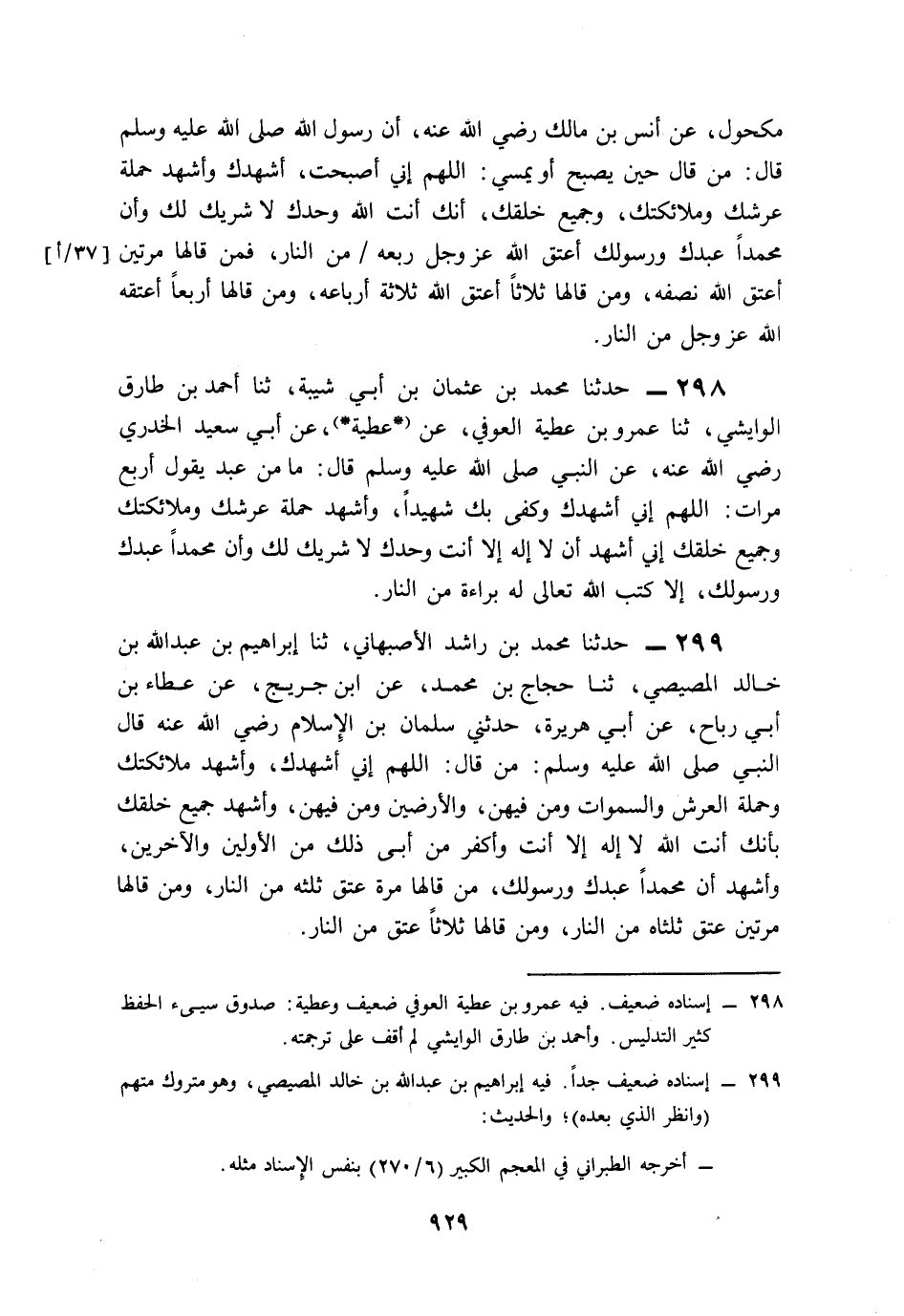 298- حَدَّثَنَا مُحَمَّدُ بْنُ عُثْمَانَ بْنِ أَبِي شَيْبَةَ، حَدَّثَنَا أَحْمَدُ بْنُ طَارِقٍ الْوَايِشِيُّ، حَدَّثَنَا عَمْرُو بْنُ عَطِيَّةَ الْعَوْفِيُّ، عَنْ عَطِيَّةَ، عَنْ أَبِي سَعِيدٍ الْخُدْرِيِّ، رَضِيَ اللَّهُ عَنْهُ, عَنِ النَّبِيِّ صَلى الله عَلَيه وَسَلم قَالَ: مَا مِنْ عَبْدٍ يَقُولُ أَرْبَعَ مَرَّاتٍ: اللَّهُمَّ إِنِّي أُشْهِدُكَ وَكَفَى بِكَ شَهِيدًا، وَأُشْهِدُ حَمَلَةَ عَرْشِكَ وَمَلاَئِكَتَكَ وَجَمِيعَ خَلْقِكَ، إِنِّي أَشْهَدُ أَنْ لاَ إِلَهَ إِلاَّ أَنْتَ وَحْدَكَ لاَ شَرِيكَ لَكَ, وَأَنَّ مُحَمَّدًا عَبْدُكَ وَرَسُولُكَ, إِلاَّ كَتَبَ اللَّهُ تَعَالَى لَهُ بَرَاءَةً مِنَ النَّارِ.