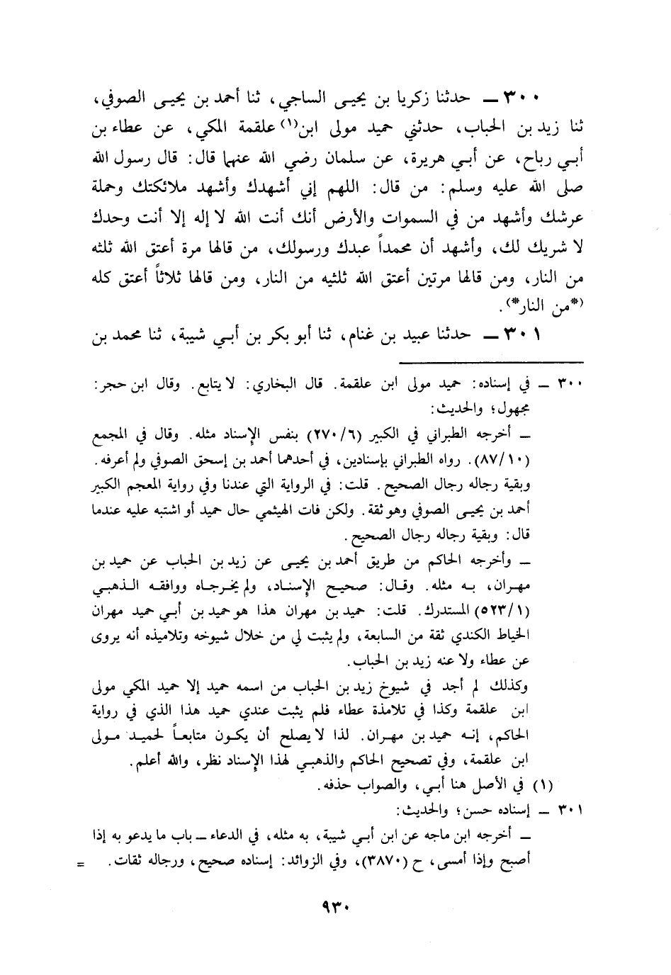 300- حَدَّثَنَا زَكَرِيَّا بْنُ يَحْيَى السَّاجِيُّ، حَدَّثَنَا أَحْمَدُ بْنُ يَحْيَى الصُّوفِيُّ، حَدَّثَنَا زَيْدُ بْنُ الْحُبَابِ، حَدَّثَنِي حُمَيْدٌ، مَوْلَى ابْنِ عَلْقَمَةَ الْمَكِّيِّ، عَنْ عَطَاءِ بْنِ أَبِي رَبَاحٍ، عَنْ أَبِي هُرَيْرَةَ، عَنْ سَلْمَانَ، رَضِيَ اللَّهُ عَنْهُمَا قَالَ: قَالَ رَسُولُ اللهِ صَلى الله عَلَيه وَسَلم: مَنْ قَالَ: اللَّهُمَّ إِنِّي أُشْهِدُكَ وَأُشْهِدُ مَلاَئِكَتَكَ وَحَمَلَةَ عَرْشِكَ، وَأُشْهِدُ مَنْ فِي السَّمَاوَاتِ وَالأَرْضِ أَنَّكَ أَنْتَ اللَّهُ، لاَ إِلَهَ إِلاَّ أَنْتَ, وَحْدَكَ لاَ شَرِيكَ لَكَ، وَأَشْهَدُ أَنَّ مُحَمَّدًا عَبْدُكَ وَرَسُولُكَ، مَنْ قَالَهَا مَرَّةً أَعْتَقَ اللَّهُ ثُلُثَهُ مِنَ النَّارِ، وَمَنْ قَالَهَا مَرَّتَيْنِ أَعْتَقَ اللَّهُ ثُلُثَيْهِ مِنَ النَّارِ، وَمَنْ قَالَهَا ثَلاَثًا أَعْتَقَ كُلَّهُ مِنَ النَّارِ.