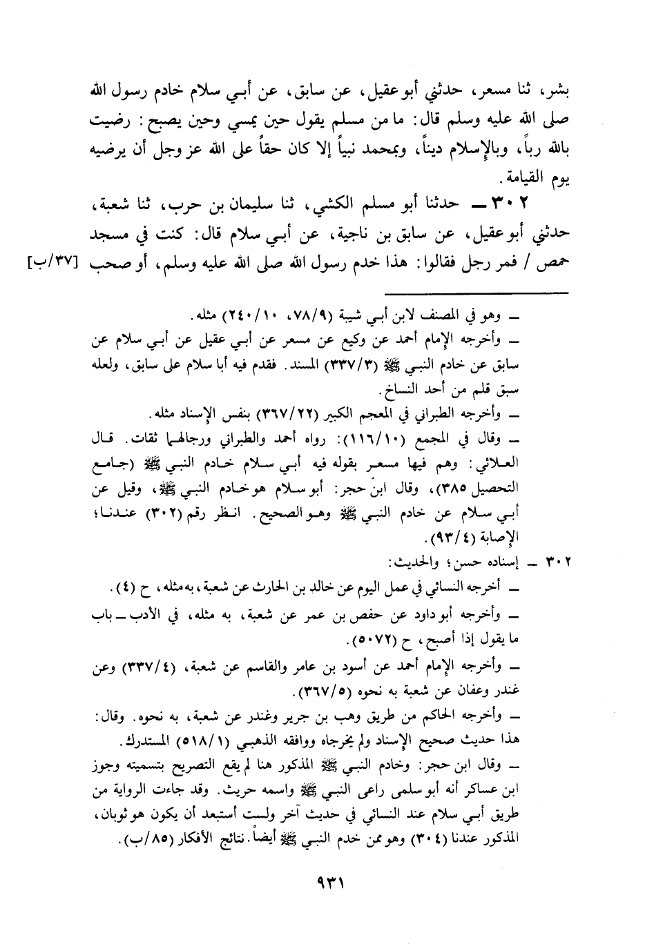 302- حَدَّثَنَا أَبُو مُسْلِمٍ الْكَشِّيُّ، حَدَّثَنَا سُلَيْمَانُ بْنُ حَرْبٍ، حَدَّثَنَا شُعْبَةُ، حَدَّثَنِي أَبُو عَقِيلٍ، عَنْ سَابِقِ بْنِ نَاجِيَةَ، عَنْ أَبِي سَلاَّمٍ، قَالَ: كُنْتُ فِي مَسْجِدِ حِمْصَ, فَمَرَّ رَجُلٌ, فَقَالُوا: هَذَا خَدَمَ رَسُولَ اللهِ صَلى الله عَلَيه وَسَلم, أَوْ صَحِبَ النَّبِيَّ صَلى الله عَلَيه وَسَلم, فَقُمْتُ إِلَيْهِ, فَقُلْتُ: حَدِّثْنِي بِحَدِيثٍ سَمِعْتَهُ مِنْ رَسُولِ اللهِ صَلى الله عَلَيه وَسَلم لَمْ يَتَدَاوَلْهُ بَيْنَكَ وَبَيْنَهُ الرِّجَالُ، فَقَالَ: سَمِعْتُ رَسُولَ اللهِ صَلى الله عَلَيه وَسَلم يَقُولُ: مَا مِنْ مُسْلِمٍ يَقُولُ إِذَا أَصْبَحَ وَإِذَا أَمْسَى ثَلاَثَ مَرَّاتٍ: رَضِيتُ بِاللهِ رَبًّا، وَبِالإِسْلاَمِ دِينًا، وَبِمُحَمَّدٍ نَبِيًّا, إِلاَّ كَانَ حَقًّا عَلَى اللهِ عَزَّ وَجَلَّ أَنْ يُرْضِيَهُ يَوْمَ الْقِيَامَةِ.
