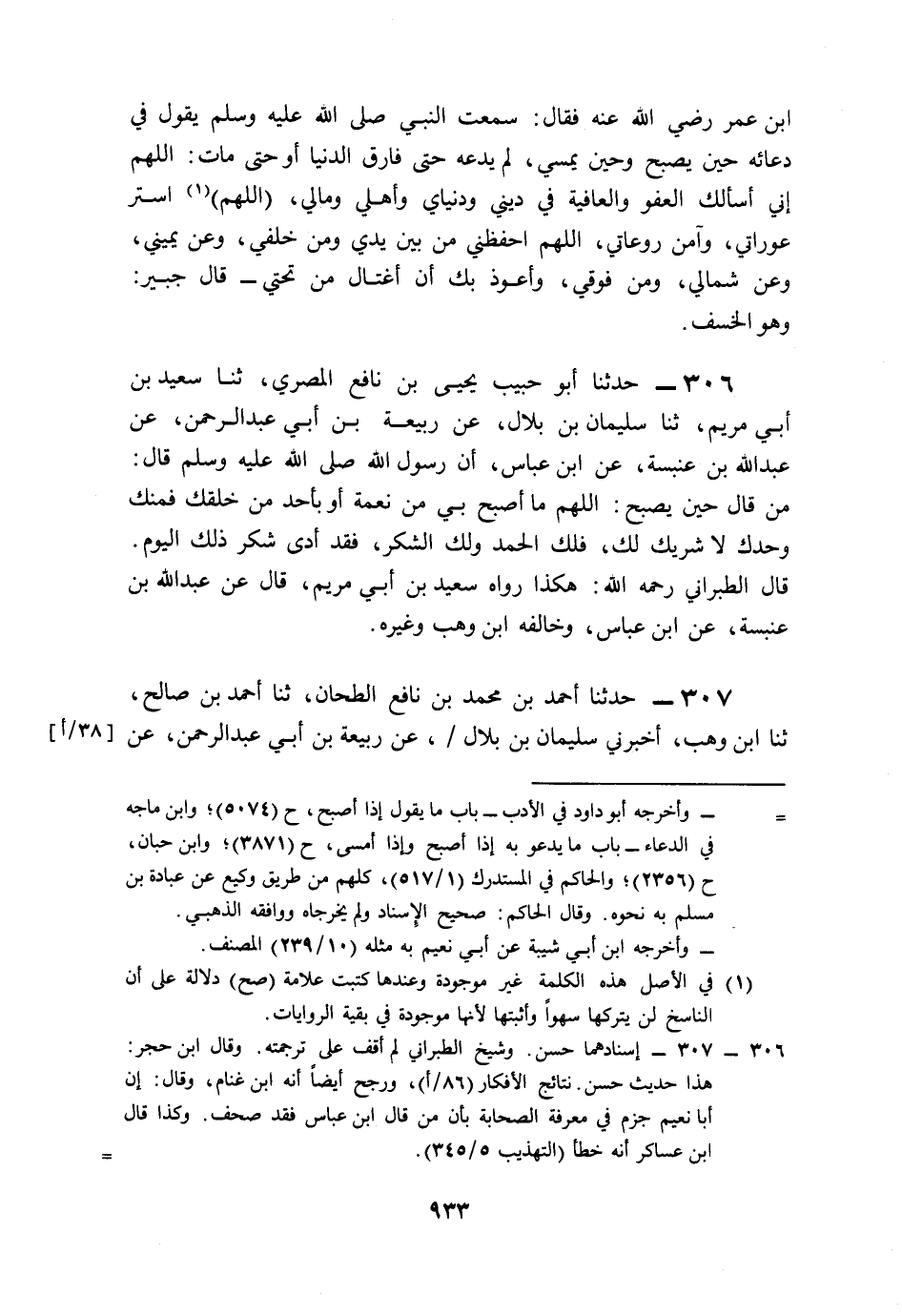 306- حَدَّثَنَا أَبُو حَبِيبٍ يَحْيَى بْنُ نَافِعٍ الْمِصْرِيُّ، حَدَّثَنَا سَعِيدُ بْنُ أَبِي مَرْيَمَ، حَدَّثَنَا سُلَيْمَانُ بْنُ بِلاَلٍ، عَنْ رَبِيعَةَ بْنِ أَبِي عَبْدِ الرَّحْمَنِ، عَنْ عَبْدِ اللهِ بْنِ عَنْبَسَةَ، عَنِ ابْنِ عَبَّاسٍ، أَنَّ رَسُولَ اللهِ صَلى الله عَلَيه وَسَلم قَالَ: مَنْ قَالَ حِينَ يُصْبِحُ: اللَّهُمَّ مَا أَصْبَحَ بِي مِنْ نِعْمَةٍ أَوْ بِأَحَدٍ مِنْ خَلْقِكَ, فَمِنْكَ وَحْدَكَ لاَ شَرِيكَ لَكَ، فَلَكَ الْحَمْدُ وَلَكَ الشُّكْرُ، فَقَدْ أَدَّى شُكْرَ ذَلِكَ الْيَوْمَ.
