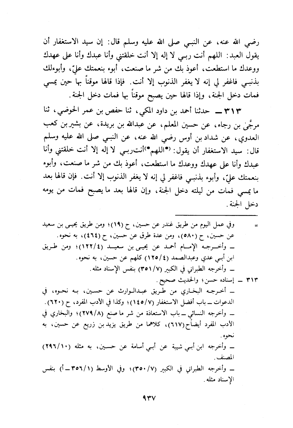 313- حَدَّثَنَا أَحْمَدُ بْنُ دَاوُدَ الْمَكِّيُّ، حَدَّثَنَا حَفْصُ بْنُ عُمَرَ الْحَوْضِيُّ، حَدَّثَنَا مُرَجَّى بْنُ رَجَاءٍ، عَنْ حُسَيْنٍ الْمُعَلِّمِ، عَنْ عَبْدِ اللهِ بْنِ بُرَيْدَةَ، عَنْ بُشَيْرِ بْنِ كَعْبٍ الْعَدَوِيُّ، عَنْ شَدَّادِ بْنِ أَوْسٍ، رَضِيَ اللَّهُ عَنْهُ, عَنِ النَّبِيِّ صَلى الله عَلَيه وَسَلم قَالَ: سَيِّدُ الِاسْتِغْفَارِ أَنْ يَقُولَ: اللَّهُمَّ أَنْتَ رَبِّي لاَ إِلَهَ إِلاَّ أَنْتَ، خَلَقْتَنِي وَأَنَا عَبْدُكَ, وَأَنَا عَلَى عَهْدِكَ وَوَعْدِكَ مَا اسْتَطَعْتُ، أَعُوذُ بِكَ مِنْ شَرِّ مَا صَنَعْتُ، وَأَبُوءُ بِنِعْمَتِكَ عَلَيَّ, وَأَبُوءُ بِذَنْبِي، فَاغْفِرْ لِي, إِنَّهُ لاَ يَغْفِرُ الذُّنُوبَ إِلاَّ أَنْتَ، فَإِنْ قَالَهَا بَعْدَ مَا يُمْسِي, فَمَاتَ مِنْ لَيْلَتِهِ دَخَلَ الْجَنَّةَ، وَإِنْ قَالَهَا بَعْدَ مَا يُصْبِحُ, فَمَاتَ مِنْ يَوْمِهِ دَخَلَ الْجَنَّةِ.