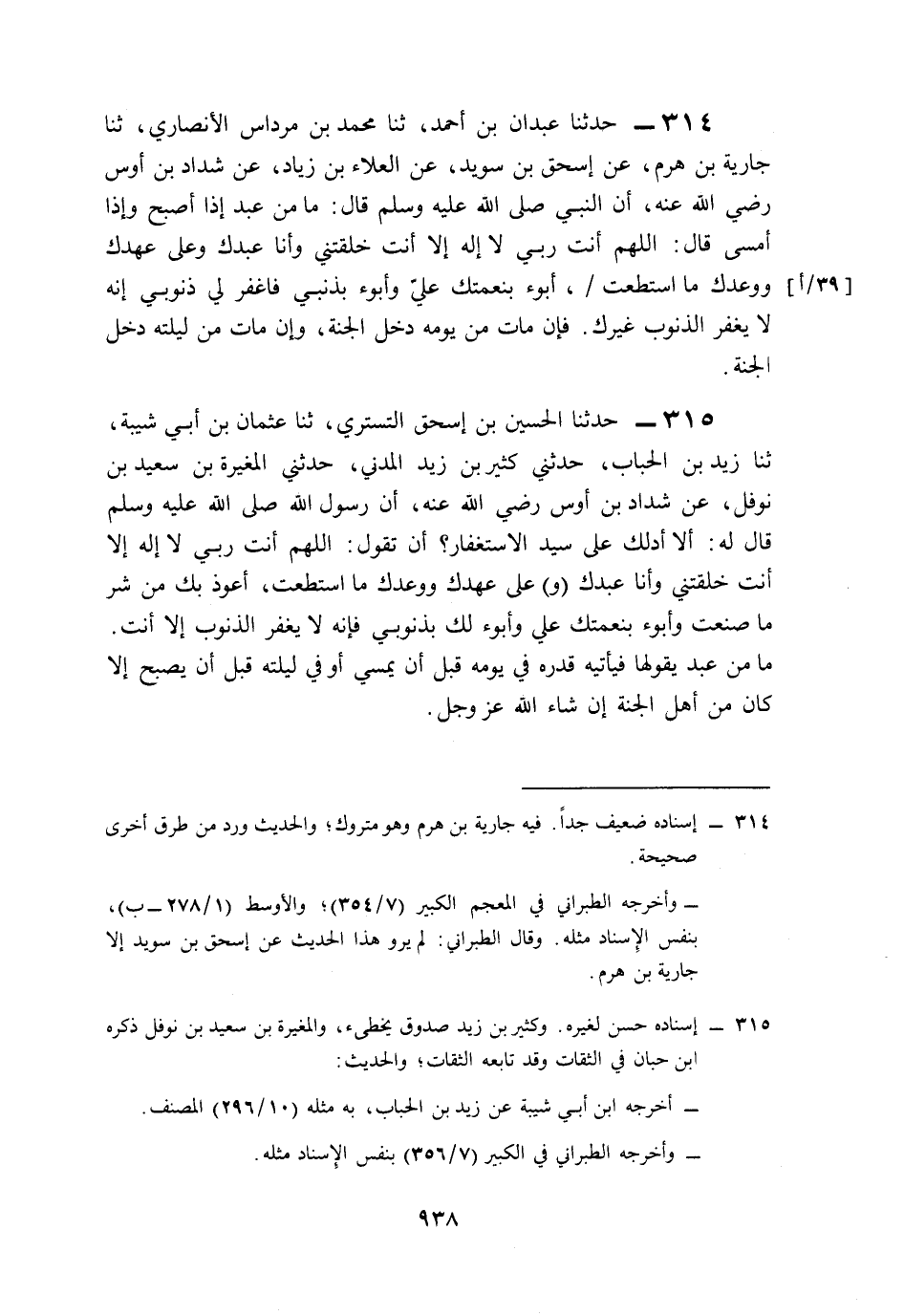 315- حَدَّثَنَا الْحُسَيْنُ بْنُ إِسْحَاقَ التُّسْتَرِيُّ، حَدَّثَنَا عُثْمَانُ بْنُ أَبِي شَيْبَةَ، حَدَّثَنَا زَيْدُ بْنُ الْحُبَابِ، حَدَّثَنِي كَثِيرُ بْنُ زَيْدٍ الْمَدَنِيُّ، حَدَّثَنِي الْمُغِيرَةُ بْنُ سَعِيدِ بْنِ نَوْفَلٍ، عَنْ شَدَّادِ بْنِ أَوْسٍ، رَضِيَ اللَّهُ عَنْهُ, أَنَّ رَسُولَ اللهِ صَلى الله عَلَيه وَسَلم قَالَ لَهُ: أَلاَ أَدُلُّكَ عَلَى سَيِّدِ الِاسْتِغْفَارِ، أَنْ تَقُولَ: اللَّهُمَّ أَنْتَ رَبِّي لاَ إِلَهَ إِلاَّ أَنْتَ، خَلَقْتَنِي وَأَنَا عَبْدُكَ, وَعَلَى عَهْدِكَ وَوَعْدِكَ مَا اسْتَطَعْتُ، أَعُوذُ بِكَ مِنْ شَرِّ مَا صَنَعْتُ، وَأَبُوءُ بِنِعْمَتِكَ عَلَيَّ، وَأَبُوءُ لَكَ بِذُنُوبِي, فَإِنَّهُ لاَ يَغْفِرُ الذُّنُوبَ إِلاَّ أَنْتَ، مَا مِنْ عَبْدٍ يَقُولُهَا فَيَأْتِيهِ قَدَرُهُ فِي يَوْمِهِ قَبْلَ أَنْ يُمْسِيَ, أَوْ فِي لَيْلَتِهِ قَبْلَ أَنْ يُصْبِحَ, إِلاَّ كَانَ مِنْ أَهْلِ الْجَنَّةِ إِنْ شَاءَ اللَّهُ عَزَّ وَجَلَّ.