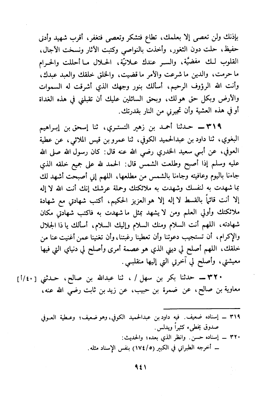 319- حَدَّثَنَا أَحْمَدُ بْنُ زُهَيْرٍ التُّسْتَرِيُّ، حَدَّثَنَا إِسْحَاقُ بْنُ إِبْرَاهِيمَ الْبَغَوِيُّ، حَدَّثَنَا دَاوُدُ بْنُ عَبْدِ الْحَمِيدِ الْكُوفِيُّ، حَدَّثَنَا عَمْرُو بْنُ قَيْسٍ الْمُلاَئِيُّ، عَنْ عَطِيَّةَ الْعَوْفِيِّ، عَنْ أَبِي سَعِيدٍ الْخُدْرِيِّ، رَضِيَ اللَّهُ عَنْهُ قَالَ: كَانَ رَسُولُ اللهِ صَلى الله عَلَيه وَسَلم إِذَا أَصْبَحَ وَطَلَعَتِ الشَّمْسُ قَالَ: الْحَمْدُ لِلَّهِ عَلَى جَمِيعِ خَلْقِهِ الَّذِي جَاءَنَا بِالْيَوْمِ وَعَافِيَتِهِ، وَجَاءَنَا بِالشَّمْسِ مِنْ مَطْلِعِهَا، اللَّهُمَّ إِنِّي أَصْبَحْتُ أَشْهَدُ لَكَ بِمَا شَهِدْتَ بِهِ لِنَفْسِكَ، وَشَهِدَتْ بِهِ مَلاَئِكَتُكَ, وَحَمَلَةُ عَرْشِكَ، إِنَّكَ أَنْتَ اللَّهُ لاَ إِلَهَ إِلاَّ أَنْتَ قَائِمًا بِالْقِسْطِ, لاَ إِلَهَ إِلاَّ هُوَ الْعَزِيزُ الْحَكِيمُ، اكْتُبْ شَهَادَتِي مَعَ شَهَادَةِ مَلاَئِكَتِكَ وَأُولِي الْعِلْمِ، وَمَنْ لاَ يَشْهَدُ بِمِثْلِ مَا شَهِدْتَ بِهِ فَاكْتُبْ شَهَادَتِي مَكَانَ شَهَادَتِهِ، اللَّهُمَّ أَنْتَ السَّلاَمُ وَمِنْكَ السَّلاَمُ وَإِلَيْكَ السَّلاَمُ، أَسْأَلُكَ يَا ذَا الْجَلاَلِ وَالإِكْرَامِ أَنْ تَسْتَجِيبَ دَعَوْتَنَا، وَأَنْ تُعْطِيَنَا رَغْبَتَنَا، وَأَنْ تُغْنِيَنَا عَمَّنْ أَغْنَيْتَ عَنَّا مِنْ خَلْقِكَ، اللَّهُمَّ أَصْلِحْ لِي دِينِي الَّذِي هُوَ عِصْمَةُ أَمْرِي، وَأَصْلِحْ لِي دُنْيَايَ الَّتِي فِيهَا مَعِيشَتِي، وَأَصْلِحْ لِي آخِرَتِي الَّتِي إِلَيْهَا مُنْقَلَبِي.