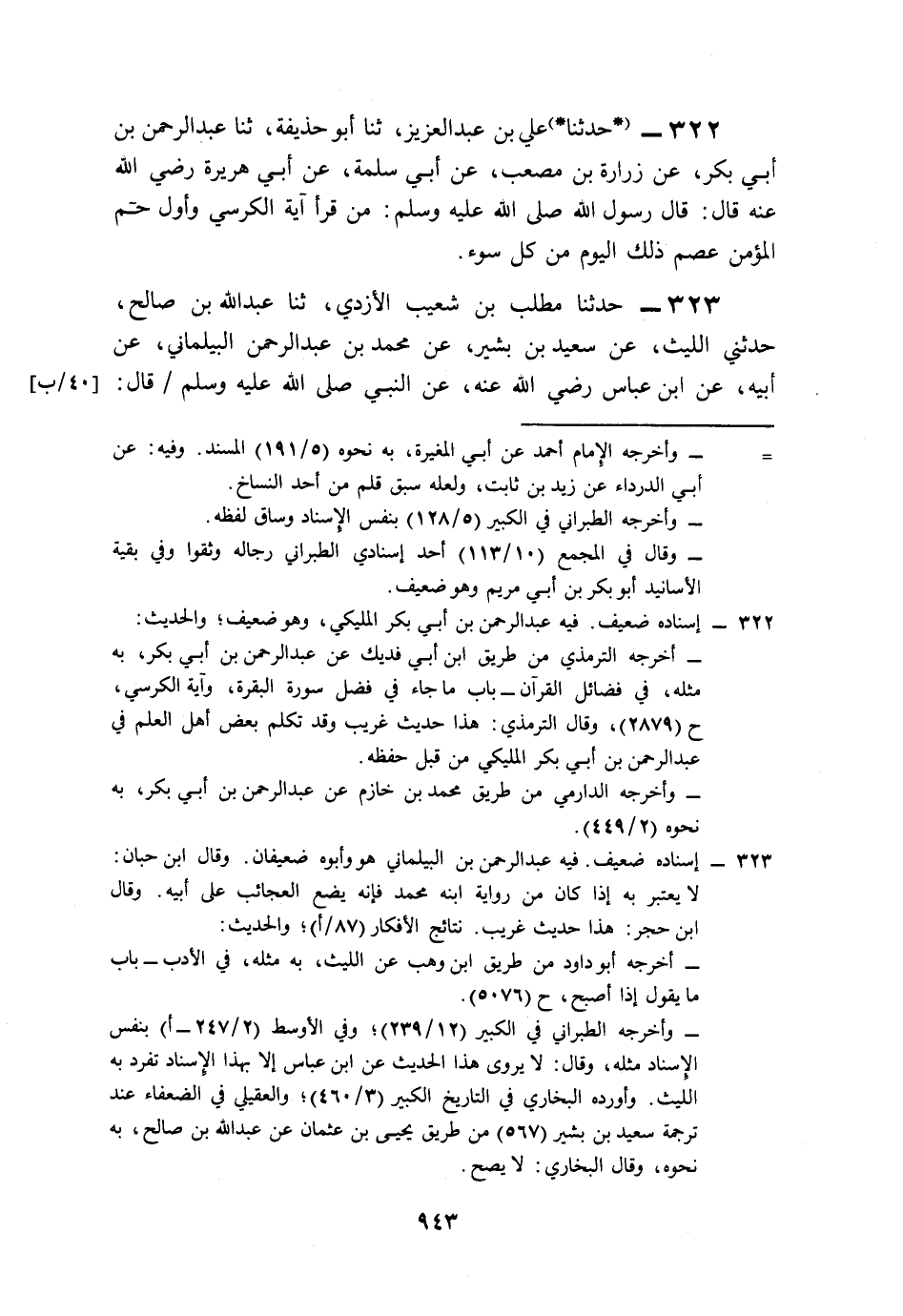 323- حَدَّثَنَا مُطَّلِبُ بْنُ شُعَيْبٍ الأَزْدِيُّ، حَدَّثَنَا عَبْدُ اللهِ بْنُ صَالِحٍ، حَدَّثَنِي اللَّيْثُ، عَنْ سَعِيدِ بْنِ بَشِيرٍ، عَنْ مُحَمَّدِ بْنِ عَبْدِ الرَّحْمَنِ الْبَيْلَمَانِيِّ، عَنْ أَبِيهِ، عَنِ ابْنِ عَبَّاسٍ، رَضِيَ اللَّهُ عَنْهُ, عَنِ النَّبِيِّ صَلى الله عَلَيه وَسَلم قَالَ: مَنْ قَالَ حِينَ يُصْبِحُ: {فَسُبْحَانَ اللهِ حِينَ تُمْسُونَ وَحِينَ تُصْبِحُونَ} إِلَى: {وَكَذَلِكَ تُخْرَجُونَ} أَدْرَكَ مَا فَاتَهُ مِنْ يَوْمِهِ، وَمَنْ قَالَهَا حِينَ يُمْسِي, أَدْرَكَ مَا فَاتَهُ فِي لَيْلَتِهِ.