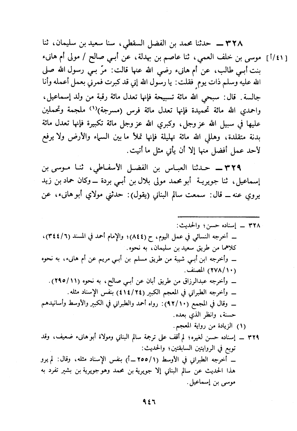 328- حَدَّثَنَا مُحَمَّدُ بْنُ الْفَضْلِ السَّقَطِيُّ، حَدَّثَنَا سَعِيدُ بْنُ سُلَيْمَانَ، حَدَّثَنَا مُوسَى بْنُ خَلَفٍ الْعَمِّيُّ، حَدَّثَنَا عَاصِمُ ابْنُ بَهْدَلَةَ، عَنْ أَبِي صَالِحٍ, مَوْلَى أُمِّ هَانِئٍ بِنْتِ أَبِي طَالِبٍ, عَنْ أُمِّ هَانِئٍ، رَضِيَ اللَّهُ عَنْهَا قَالَتْ: مَرَّ بِي رَسُولُ اللهِ صَلى الله عَلَيه وَسَلم ذَاتَ يَوْمٍ, فَقُلْتُ: يَا رَسُولَ اللهِ, إِنِّي قَدْ كَبِرْتُ, فَمُرْنِي بِعَمَلٍ أَعْمَلُهُ وَأَنَا جَالِسَةٌ، قَالَ: سَبِّحِي اللَّهَ مِئَةَ تَسْبِيحَةٍ, فَإِنَّهَا تَعْدِلُ مِئَةَ رَقَبَةٍ مِنْ وَلَدِ إِسْمَاعِيلَ، وَاحْمَدِي اللَّهَ مِئَةَ تَحْمِيدَةٍ, فَإِنَّهَا تَعْدِلُ مِئَةَ فَرَسٍ مُسْرَجَةٍ مُلْجَمَةٍ, وَتَحْمِلِينَ عَلَيْهَا فِي سَبِيلِ اللهِ عَزَّ وَجَلَّ، وَكَبِّرِي اللَّهَ عَزَّ وَجَلَّ مِئَةَ تَكْبِيرَةٍ, فَإِنَّهَا تَعْدِلُ مِئَةَ بَدَنَةٍ مُتَقَلِّدَةٍ، وَهَلِّلِي اللَّهَ مِئَةَ تَهْلِيلَةٍ, فَإِنَّهَا تَمْلَأُ مَا بَيْنَ السَّمَاءِ وَالأَرْضِ، وَلاَ يُرْفَعُ لِأَحَدٍ عَمَلٌ أَفْضَلُ مِنْهَا, إِلاَّ أَنْ يَأْتِيَ مِثْلَ مَا أَتَيْتِ.