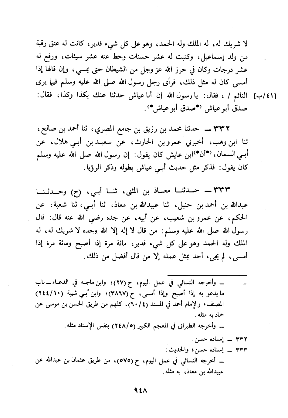 333- حَدَّثَنَا مُعَاذُ بْنُ الْمُثَنَّى، حَدَّثَنَا أَبِي (ح) وَحَدَّثَنَا عَبْدُ اللهِ بْنُ أَحْمَدَ بْنِ حَنْبَلٍ، حَدَّثَنَا عُبَيْدُ اللهِ بْنُ مُعَاذٍ، حَدَّثَنَا أَبِي، حَدَّثَنَا شُعْبَةُ، عَنِ الْحَكَمِ، عَنْ عَمْرِو بْنِ شُعَيْبٍ، عَنْ أَبِيهِ، عَنْ جَدِّهِ، رَضِيَ اللَّهُ عَنْهُ قَالَ: قَالَ رَسُولُ اللهِ صَلى الله عَلَيه وَسَلم: مَنْ قَالَ لاَ إِلَهَ إِلاَّ اللَّهُ, وَحْدَهُ لاَ شَرِيكَ لَهُ, لَهُ الْمُلْكُ وَلَهُ الْحَمْدُ وَهُوَ عَلَى كُلِّ شَيْءٍ قَدِيرٌ مِئَةَ مَرَّةٍ إِذَا أَصْبَحَ، وَمِئَةَ مَرَّةٍ إِذَا أَمْسَى، لَمْ يَجِئْ أَحَدٌ بِمِثْلِ عَمَلِهِ, إِلاَّ مَنْ قَالَ أَفْضَلَ مِنْ ذَلِكَ.