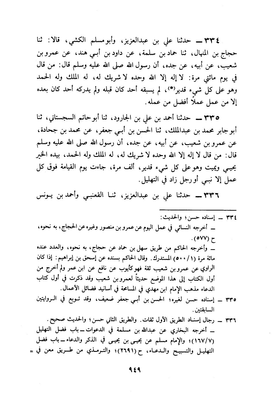 334- حَدَّثَنَا عَلِيُّ بْنُ عَبْدِ الْعَزِيزِ، وَأَبُو مُسْلِمٍ الْكَشِّيُّ, قَالاَ: حَدَّثَنَا حَجَّاجُ بْنُ الْمِنْهَالِ، حَدَّثَنَا حَمَّادُ بْنُ سَلَمَةَ، عَنْ دَاوُدَ بْنِ أَبِي هِنْدٍ، عَنْ عَمْرِو بْنِ شُعَيْبٍ، عَنْ أَبِيهِ، عَنْ جَدِّهِ، أَنَّ رَسُولَ اللهِ صَلى الله عَلَيه وَسَلم قَالَ: مَنْ قَالَ فِي يَوْمٍ مِائَتَيْ مَرَّةٍ: لاَ إِلَهَ إِلاَّ اللَّهُ وَحْدَهُ لاَ شَرِيكَ لَهُ، لَهُ الْمُلْكُ وَلَهُ الْحَمْدُ وَهُوَ عَلَى كُلِّ شَيْءٍ قَدِيرٌ, لَمْ يَسْبِقْهُ أَحَدٌ كَانَ قَبْلَهُ، وَلَمْ يُدْرِكْهُ أَحَدٌ كَانَ بَعْدَهُ, إِلاَّ مَنْ عَمِلَ عَمَلاً أَفْضَلَ مِنْ عَمَلِهِ.