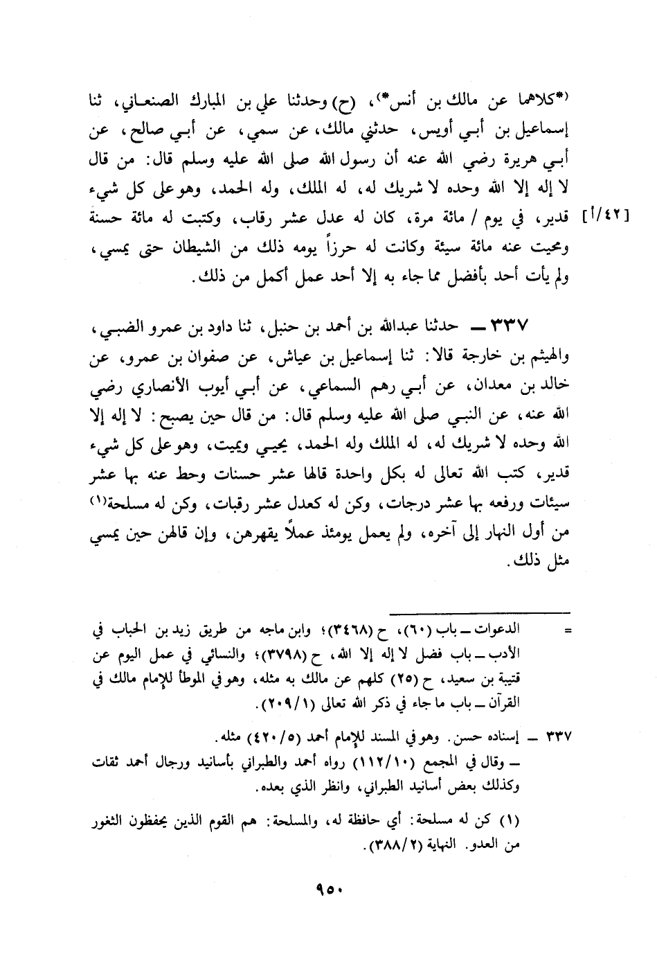 337- حَدَّثَنَا عَبْدُ اللهِ بْنُ أَحْمَدَ بْنِ حَنْبَلٍ، حَدَّثَنَا دَاوُدُ بْنُ عَمْرٍو الضَّبِّيُّ، وَالْهَيْثَمُ بْنُ خَارِجَةَ، قَالاَ: حَدَّثَنَا إِسْمَاعِيلُ بْنُ عَيَّاشٍ، عَنْ صَفْوَانَ بْنِ عَمْرٍو، عَنْ خَالِدِ بْنِ مَعْدَانَ، عَنْ أَبِي رُهْمٍ السَّمَاعِيِّ، عَنْ أَبِي أَيُّوبَ الأَنْصَارِيِّ، رَضِيَ اللَّهُ عَنْهُ, عَنِ النَّبِيِّ صَلى الله عَلَيه وَسَلم قَالَ: مَنْ قَالَ حِينَ يُصْبِحُ: لاَ إِلَهَ إِلاَّ اللَّهُ وَحْدَهُ لاَ شَرِيكَ لَهُ, لَهُ الْمُلْكُ وَلَهُ الْحَمْدُ, يُحْيِي وَيُمِيتُ, وَهُوَ عَلَى كُلِّ شَيْءٍ قَدِيرٌ, كَتَبَ اللَّهُ تَعَالَى لَهُ بِكُلِّ وَاحِدَةٍ قَالَهَا عَشْرَ حَسَنَاتٍ، وَحَطَّ عَنْهُ بِهَا عَشْرَ سَيِّئَاتٍ، وَرَفَعَهُ بِهَا عَشْرَ دَرَجَاتٍ، وَكُنَّ لَهُ كَعَدْلِ عَشْرِ رَقَبَاتٍ، وَكُنَّ لَهُ مَسْلَحَةً مِنْ أَوَّلِ النَّهَارِ إِلَى آخِرِهِ، وَلَمْ يَعْمَلْ يَوْمَئِذٍ عَمَلاً يَقْهَرُهُنَّ، وَإِنْ قَالَهُنَّ حِينَ يُمْسِي مِثْلُ ذَلِكَ.