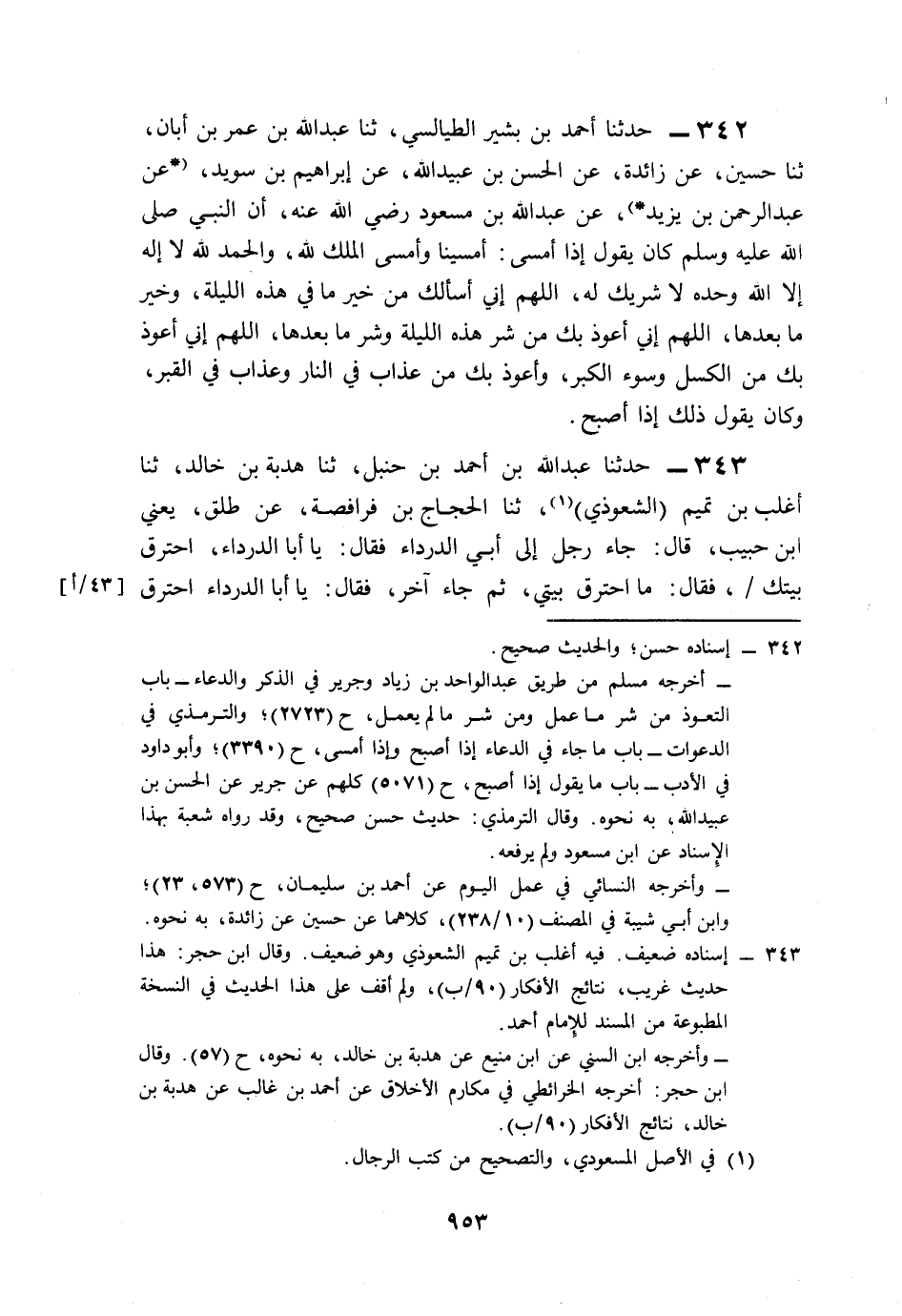 342- حَدَّثَنَا أَحْمَدُ بْنُ بَشِيرٍ الطَّيَالِسِيُّ، حَدَّثَنَا عَبْدُ اللهِ بْنُ عُمَرَ بْنِ أَبَانَ، حَدَّثَنَا حُسَيْنٌ، عَنْ زَائِدَةَ، عَنِ الْحَسَنِ بْنِ عُبَيْدِ اللهِ، عَنْ إِبْرَاهِيمَ بْنِ سُوَيْدٍ، عَنْ عَبْدِ الرَّحْمَنِ بْنِ يَزِيدَ، عَنْ عَبْدِ اللهِ بْنِ مَسْعُودٍ، رَضِيَ اللَّهُ عَنْهُ, أَنَّ النَّبِيَّ صَلى الله عَلَيه وَسَلم كَانَ يَقُولُ إِذَا أَمْسَى: أَمْسَيْنَا وَأَمْسَى الْمُلْكُ لِلَّهِ, وَالْحَمْدُ لِلَّهِ لاَ إِلَهَ إِلاَّ اللَّهُ وَحْدَهُ لاَ شَرِيكَ لَهُ، اللَّهُمَّ إِنِّي أَسْأَلُكَ مِنْ خَيْرِ مَا فِي هَذِهِ اللَّيْلَةِ، وَخَيْرِ مَا بَعْدَهَا، اللَّهُمَّ إِنِّي أَعُوذُ بِكَ مِنْ شَرِّ هَذِهِ اللَّيْلَةِ, وَشَرِّ مَا بَعْدَهَا، اللَّهُمَّ إِنِّي أَعُوذُ بِكَ مِنَ الْكَسَلِ وَسُوءِ الْكِبْرِ، وَأَعُوذُ بِكَ مِنْ عَذَابٍ فِي النَّارِ, وَعَذَابٍ فِي الْقَبْرِ, وَكَانَ يَقُولُ ذَلِكَ إِذَا أَصْبَحَ.