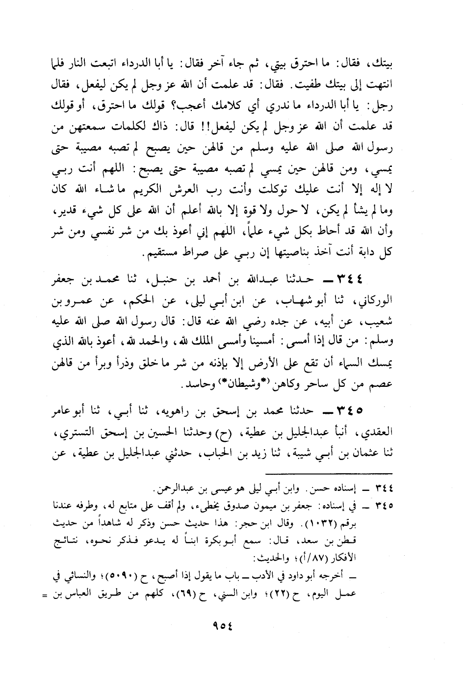 344- حَدَّثَنَا عَبْدُ اللهِ بْنُ أَحْمَدَ بْنِ حَنْبَلٍ، حَدَّثَنَا مُحَمَّدُ بْنُ جَعْفَرٍ الْوَرْكَانِيُّ، حَدَّثَنَا أَبُو شِهَابٍ، عَنِ ابْنِ أَبِي لَيْلَى، عَنِ الْحَكَمِ، عَنْ عَمْرِو بْنِ شُعَيْبٍ، عَنْ أَبِيهِ، عَنْ جَدِّهِ، رَضِيَ اللَّهُ عَنْهُ قَالَ: قَالَ رَسُولُ اللهِ صَلى الله عَلَيه وَسَلم: مَنْ قَالَ إِذَا أَمْسَى: أَمْسَيْنَا وَأَمْسَى الْمُلْكُ لِلَّهِ، وَالْحَمْدُ لِلَّهِ، أَعُوذُ بِاللهِ الَّذِي يُمْسِكُ السَّمَاءَ أَنْ تَقَعَ عَلَى الأَرْضِ إِلاَّ بِإِذْنِهِ, مِنْ شَرِّ مَا خَلَقَ, وَذَرَأَ, وَبَرَأَ، مَنْ قَالَهُنَّ عُصِمَ مِنْ كُلِّ سَاحِرٍ وَكَاهِنٍ وَشَيْطَانٍ وَحَاسِدٍ.