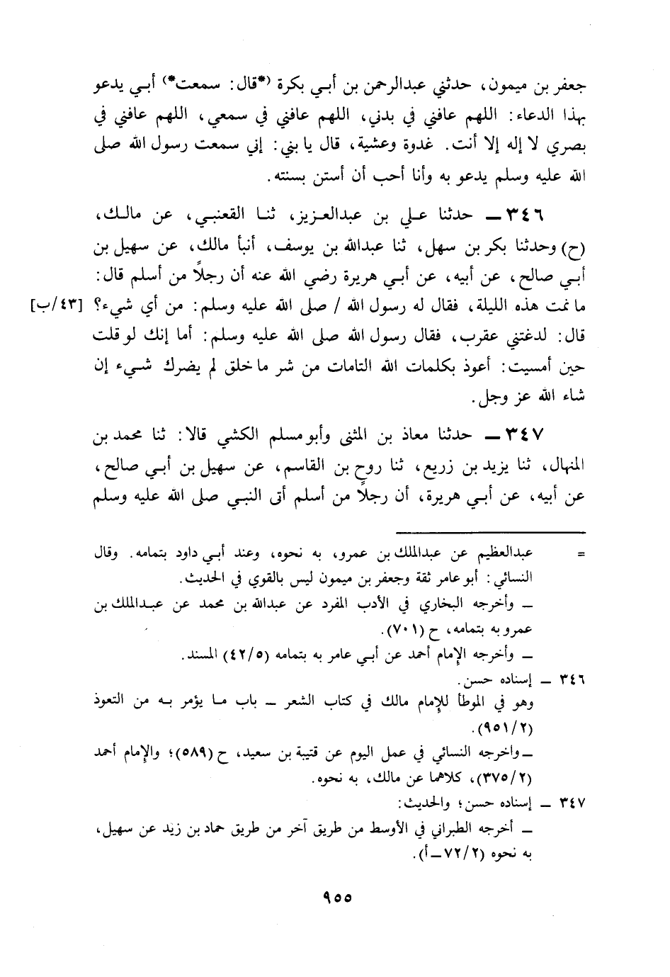 346- حَدَّثَنَا عَلِيُّ بْنُ عَبْدِ الْعَزِيزِ، حَدَّثَنَا الْقَعْنَبِيُّ، عَنْ مَالِكٍ (ح) وَحَدَّثَنَا بَكْرُ بْنُ سَهْلٍ، حَدَّثَنَا عَبْدُ اللهِ بْنُ يُوسُفَ، أَخْبَرَنَا مَالِكٌ، عَنْ سُهَيْلِ بْنِ أَبِي صَالِحٍ، عَنْ أَبِيهِ، عَنْ أَبِي هُرَيْرَةَ، رَضِيَ اللَّهُ عَنْهُ, أَنَّ رَجُلاً مِنْ أَسْلَمَ قَالَ: مَا نِمْتُ هَذِهِ اللَّيْلَةَ، فَقَالَ لَهُ رَسُولُ اللهِ صَلى الله عَلَيه وَسَلم: مِنْ أَيِّ شَيْءٍ؟ قَالَ: لَدَغَتْنِي عَقْرَبٌ، فَقَالَ رَسُولُ اللهِ صَلى الله عَلَيه وَسَلم: أَمَا إِنَّكَ لَوْ قُلْتَ حِينَ أَمْسَيْتَ: أَعُوذُ بِكَلِمَاتِ اللهِ التَّامَّاتِ, مِنْ شَرِّ مَا خَلَقَ, لَمْ يَضُرُّكْ شَيْءٌ, إِنْ شَاءَ اللَّهُ عَزَّ وَجَلَّ.