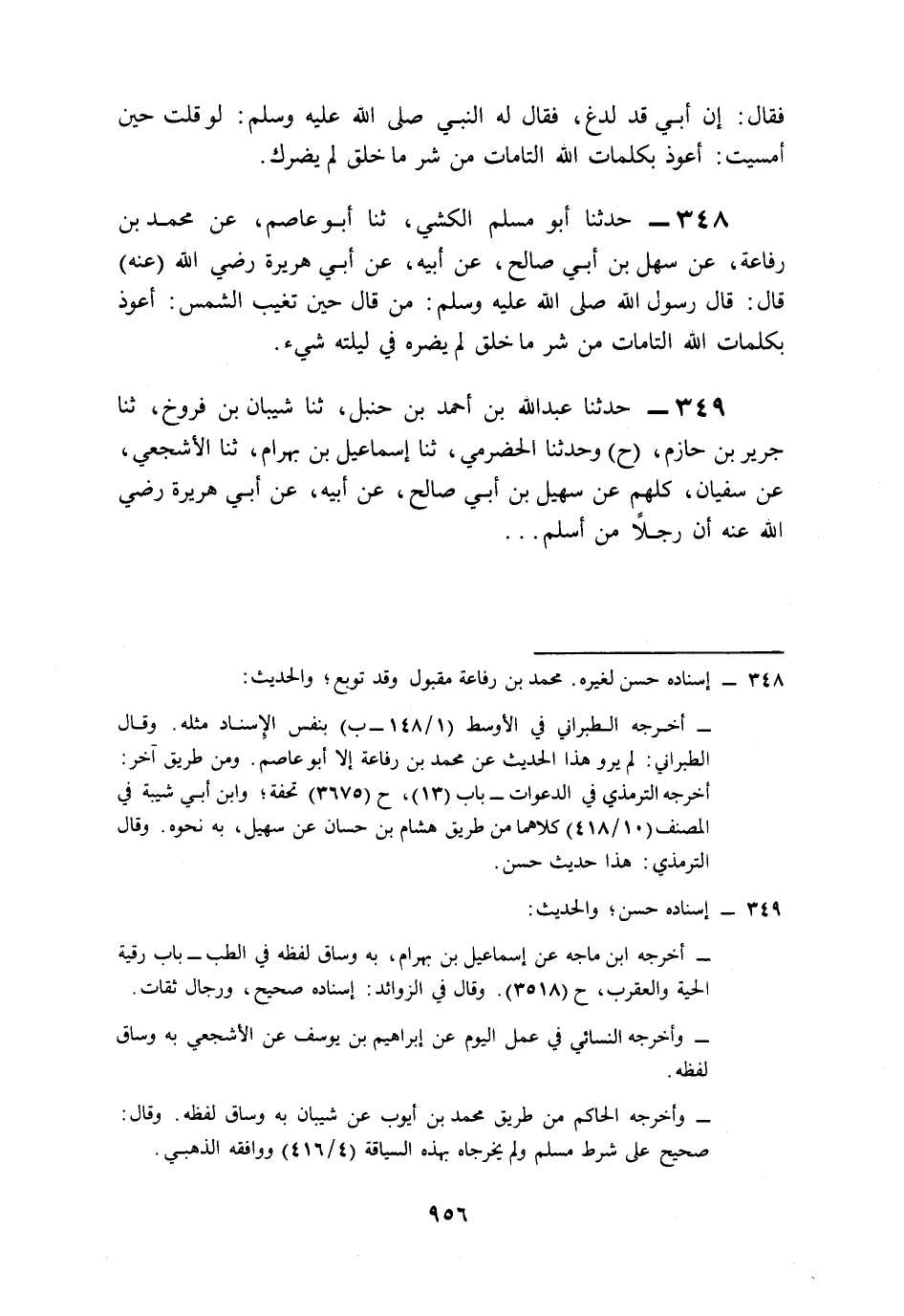 349- حَدَّثَنَا عَبْدُ اللهِ بْنُ أَحْمَدَ بْنِ حَنْبَلٍ، حَدَّثَنَا شَيْبَانُ بْنُ فَرُّوخَ، حَدَّثَنَا جَرِيرُ بْنُ حَازِمٍ (ح) وَحَدَّثَنَا الْحَضْرَمِيُّ، حَدَّثَنَا إِسْمَاعِيلُ بْنُ بَهْرَامَ، حَدَّثَنَا الأَشْجَعِيُّ، عَنْ سُفْيَانَ، كُلُّهُمْ عَنْ سُهَيْلِ بْنِ أَبِي صَالِحٍ، عَنْ أَبِيهِ، عَنْ أَبِي هُرَيْرَةَ، رَضِيَ اللَّهُ عَنْهُ, أَنَّ رَجُلاً مِنْ أَسْلَمَ (ح) وَحَدَّثَنَا مُطَّلِبُ بْنُ شُعَيْبٍ الأَزْدِيُّ, حَدَّثَنَا عَبْدُ اللهِ بْنُ صَالِحٍ، حَدَّثَنِي اللَّيْثُ، عَنْ يَزِيدَ بْنِ أَبِي حَبِيبٍ، عَنْ يَعْقُوبَ بْنِ عَبْدِ اللهِ بْنِ الأَشَجِّ، عَنْ ذَكْوَانَ أَبِي صَالِحٍ، عَنْ أَبِي هُرَيْرَةَ رَضِيَ اللَّهُ عَنْهُ قَالَ: أَتَى رَسُولَ اللهِ صَلى الله عَلَيه وَسَلم رَجُلٌ فَقَالَ: لَدَغَتْنِي عَقْرَبٌ يَا رَسُولَ اللهِ، فَقَالَ: أَمَا إِنَّكَ لَوْ قُلْتَ: أَعُوذُ بِكَلِمَاتِ اللهِ التَّامَّاتِ مِنْ شَرِّ مَا خَلَقَ لَمْ تَضُرَّكَ.