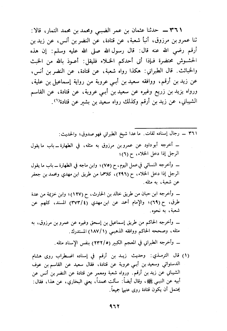 361- حَدَّثَنَا عُثْمَانُ بْنُ عُمَرَ الضَّبِّيُّ، وَمُحَمَّدُ بْنُ مُحَمَّدٍ التَّمَّارُ، قَالاَ: حَدَّثَنَا عَمْرُو بْنُ مَرْزُوقٍ، أَخْبَرَنَا شُعْبَةُ، عَنْ قَتَادَةَ، عَنِ النَّضْرِ بْنِ أَنَسٍ، عَنْ زَيْدِ بْنِ أَرْقَمَ، رَضِيَ اللَّهُ عَنْهُ قَالَ: قَالَ رَسُولُ اللهِ صَلى الله عَلَيه وَسَلم: إِنَّ هَذِهِ الْحُشُوشَ مُحْتَضَرَةٌ، فَإِذَا أَتَى أَحَدُكُمُ الْخَلاَءَ فَلْيَقُلْ: أَعُوذُ بِاللهِ مِنَ الْخُبُثِ وَالْخَبَائِثِ.