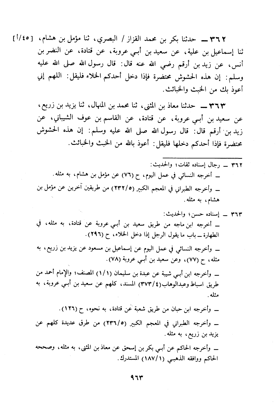 363- حَدَّثَنَا مُعَاذُ بْنُ الْمُثَنَّى، حَدَّثَنَا مُحَمَّدُ بْنُ الْمِنْهَالِ، حَدَّثَنَا يَزِيدُ بْنُ زُرَيْعٍ، عَنْ سَعِيدِ بْنِ أَبِي عَرُوبَةَ، عَنْ قَتَادَةَ، عَنِ الْقَاسِمِ بْنِ عَوْفٍ الشَّيْبَانِيِّ، عَنْ زَيْدِ بْنِ أَرْقَمَ، قَالَ: قَالَ رَسُولُ اللهِ صَلى الله عَلَيه وَسَلم: إِنَّ هَذِهِ الْحُشُوشَ مُحْتَضَرَةٌ، فَإِذَا أَحَدُكُمْ دَخَلَهَا فَلْيَقُلْ: أَعُوذُ بِاللهِ مِنَ الْخُبُثِ وَالْخَبَائِثِ.