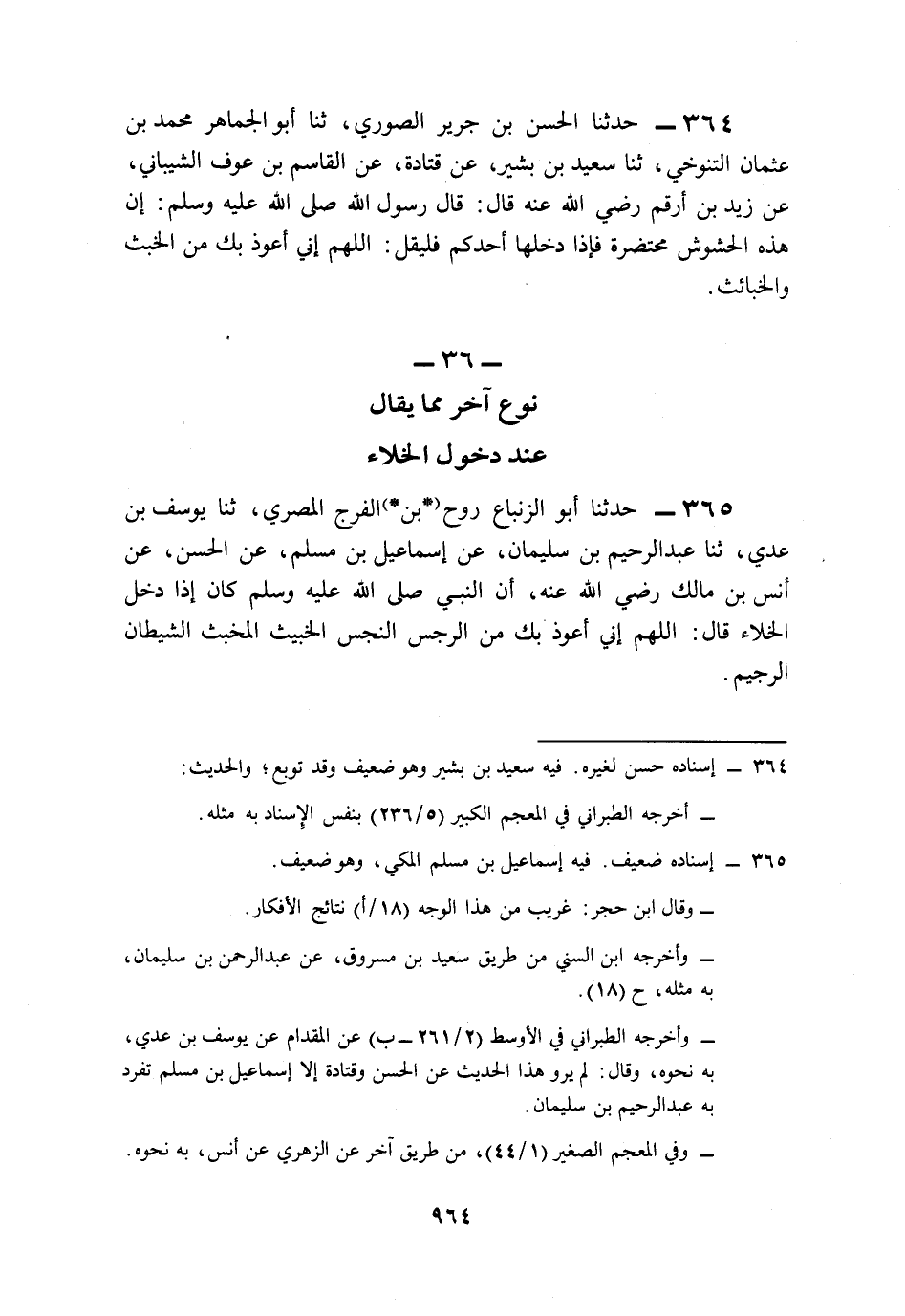 364- حَدَّثَنَا الْحَسَنُ بْنُ جَرِيرٍ الصُّورِيُّ، حَدَّثَنَا أَبُو الْجُمَاهِرِ مُحَمَّدُ بْنُ عُثْمَانَ التَّنُوخِيُّ، حَدَّثَنَا سَعِيدُ بْنُ بَشِيرٍ، عَنْ قَتَادَةَ، عَنِ الْقَاسِمِ بْنِ عَوْفِ الشَّيْبَانِيِّ، عَنْ زَيْدِ بْنِ أَرْقَمَ، رَضِيَ اللَّهُ عَنْهُ قَالَ: قَالَ رَسُولُ اللهِ صَلى الله عَلَيه وَسَلم: إِنَّ هَذِهِ الْحُشُوشَ مُحْتَضَرَةٌ، فَإِذَا دَخَلَهَا أَحَدُكُمْ فَلْيَقُلِ: اللَّهُمَّ إِنِّي أَعُوذُ بِكَ مِنَ الْخُبُثِ وَالْخَبَائِثِ.