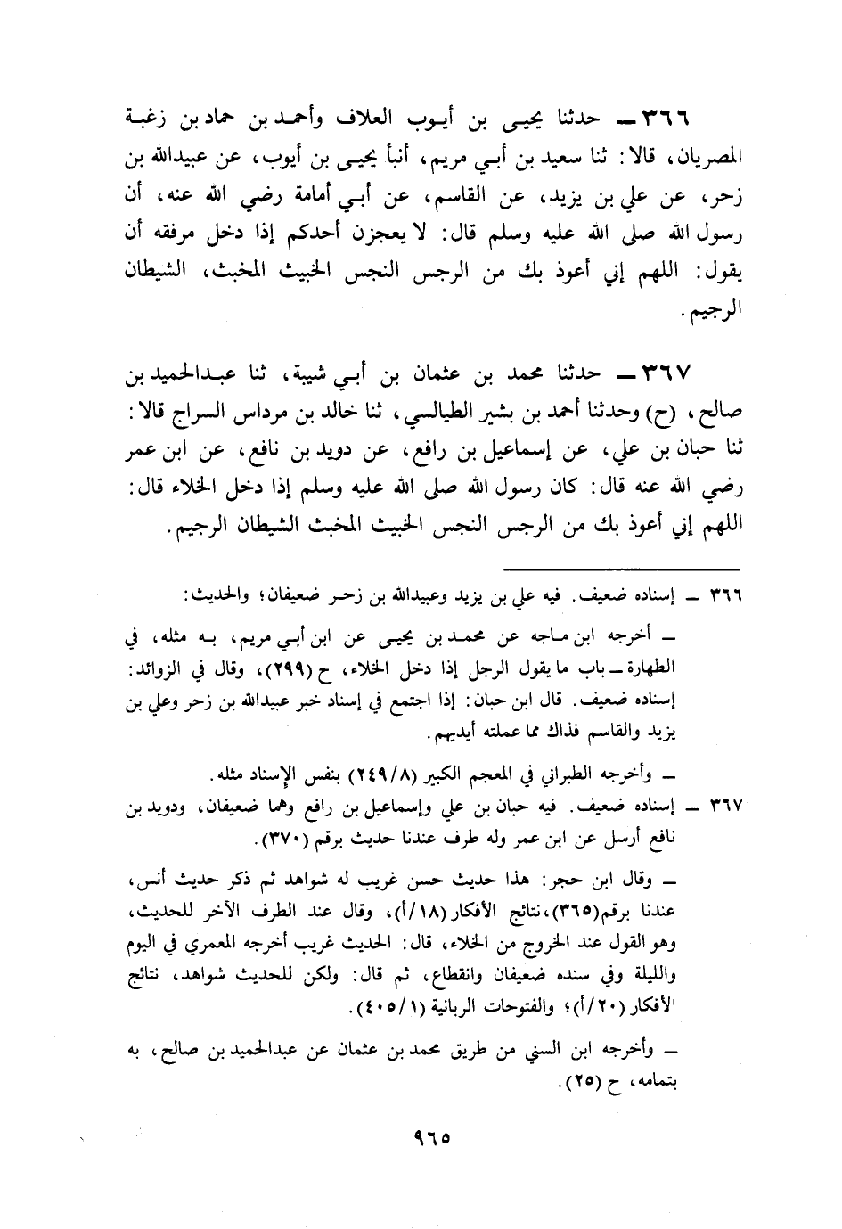 367- حَدَّثَنَا مُحَمَّدُ بْنُ عُثْمَانَ بْنِ أَبِي شَيْبَةَ، حَدَّثَنَا عَبْدُ الْحَمِيدِ بْنُ صَالِحٍ (ح) وَحَدَّثَنَا أَحْمَدُ بْنُ بَشِيرٍ الطَّيَالِسِيُّ، حَدَّثَنَا خَالِدُ بْنُ مِرْدَاسٍ السَّرَّاجُ، قَالاَ: حَدَّثَنَا حِبَّانُ بْنُ عَلِيٍّ، عَنْ إِسْمَاعِيلَ بْنِ رَافِعٍ، عَنْ دُوَيْدِ بْنِ نَافِعٍ، عَنِ ابْنِ عُمَرَ، رَضِيَ اللَّهُ عَنْهُ قَالَ: كَانَ رَسُولُ اللهِ صَلى الله عَلَيه وَسَلم إِذَا دَخَلَ الْخَلاَءَ قَالَ: اللَّهُمَّ إِنِّي أَعُوذُ بِكَ مِنَ الرِّجْسِ النَّجِسِ الْخَبِيثِ الْمُخَبَّثِ الشَّيْطَانِ الرَّجِيمِ.