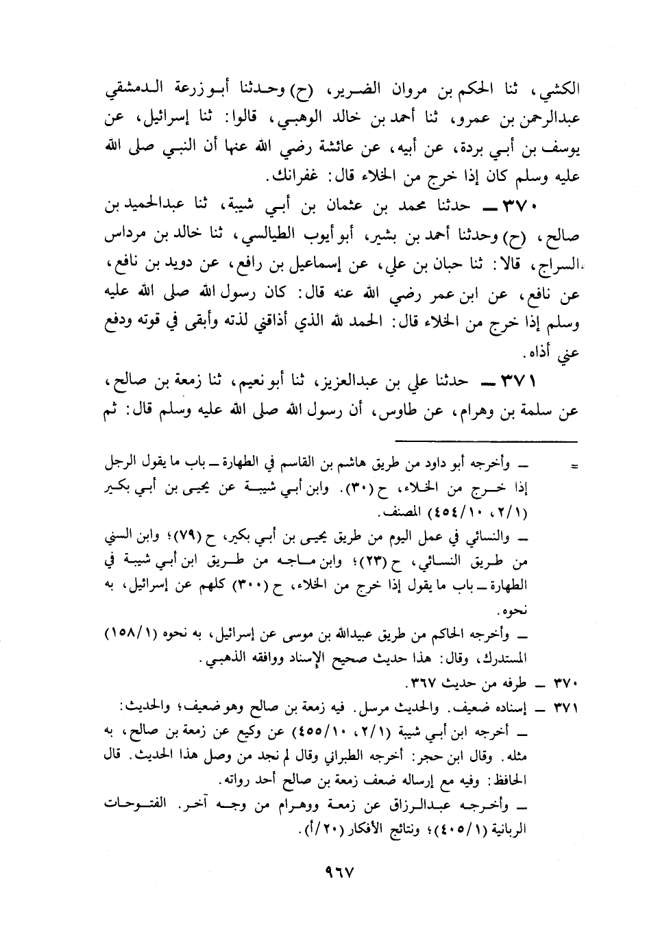 370- حَدَّثَنَا مُحَمَّدُ بْنُ عُثْمَانَ بْنِ أَبِي شَيْبَةَ، حَدَّثَنَا عَبْدُ الْحَمِيدِ بْنُ صَالِحٍ (ح) وَحَدَّثَنَا أَحْمَدُ بْنُ بَشِيرٍ, أَبُو أَيُّوبَ الطَّيَالِسِيُّ، حَدَّثَنَا خَالِدُ بْنُ مِرْدَاسٍ السَّرَّاجُ، قَالاَ: حَدَّثَنَا حِبَّانُ بْنُ عَلِيٍّ، عَنْ إِسْمَاعِيلَ بْنِ رَافِعٍ، عَنْ دُوَيْدِ بْنِ نَافِعٍ، عَنْ نَافِعٍ، عَنِ ابْنِ عُمَرَ، رَضِيَ اللَّهُ عَنْهُ قَالَ: كَانَ رَسُولُ اللهِ صَلى الله عَلَيه وَسَلم إِذَا خَرَجَ مِنَ الْخَلاَءِ قَالَ: الْحَمْدُ لِلَّهِ الَّذِي أَذَاقَنِي لَذَّتَهُ, وَأَبْقَى فِيَّ قُوَّتَهُ, وَدَفَعَ عَنِّي أَذَاهُ.