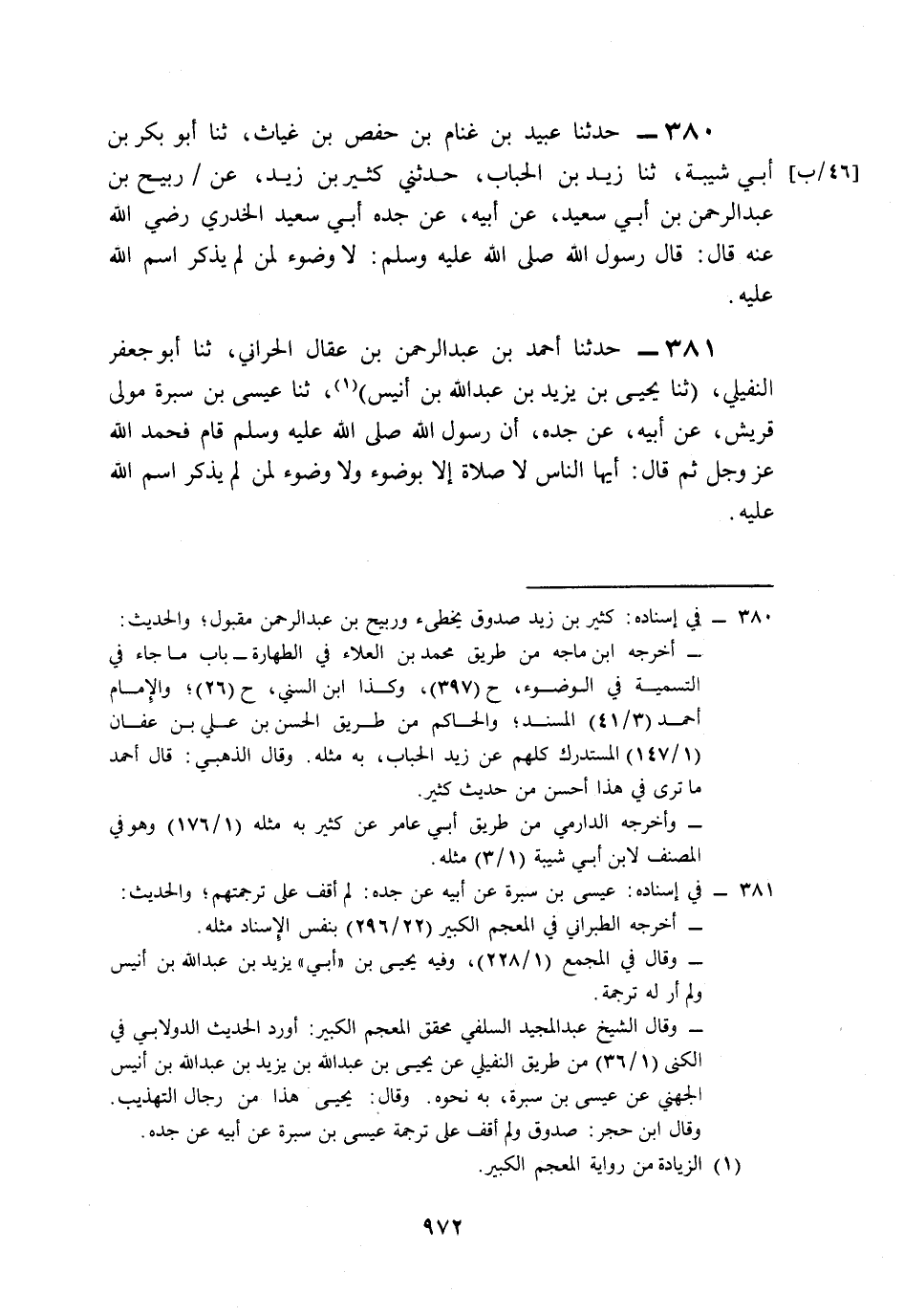 380- حَدَّثَنَا عُبَيْدُ بْنُ غَنَّامِ بْنِ حَفْصِ بْنِ غِيَاثٍ، حَدَّثَنَا أَبُو بَكْرِ بْنُ أَبِي شَيْبَةَ، حَدَّثَنَا زَيْدُ بْنُ الْحُبَابِ، حَدَّثَنِي كَثِيرُ بْنُ زَيْدٍ، عَنْ رُبَيْحِ بْنِ عَبْدِ الرَّحْمَنِ بْنِ أَبِي سَعِيدٍ، عَنْ أَبِيهِ، عَنْ جَدِّهِ أَبِي سَعِيدٍ الْخُدْرِيِّ، رَضِيَ اللَّهُ عَنْهُ قَالَ: قَالَ رَسُولُ اللهِ صَلى الله عَلَيه وَسَلم: لاَ وُضُوءَ لِمَنْ لَمْ يَذْكُرِ اسْمَ اللهِ عَلَيْهِ.