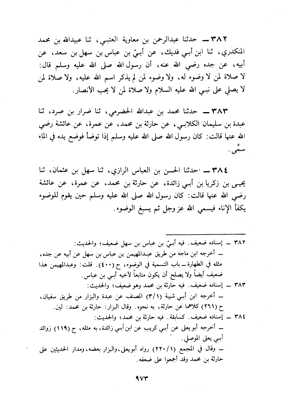 384- حَدَّثَنَا الْحَسَنُ بْنُ الْعَبَّاسِ الرَّازِيُّ، حَدَّثَنَا سَهْلُ بْنُ عُثْمَانَ، حَدَّثَنَا يَحْيَى بْنُ زَكَرِيَّا بْنِ أَبِي زَائِدَةَ، عَنْ حَارِثَةَ بْنِ مُحَمَّدٍ، عَنْ عَمْرَةَ، عَنْ عَائِشَةَ، رَضِيَ اللَّهُ عَنْهَا قَالَتْ: كَانَ رَسُولُ اللهِ صَلى الله عَلَيه وَسَلم حِينَ يَقُومُ لِلْوضُوءِ, يَكْفَأُ الإِنَاءَ, فَيُسَمِّي اللَّهَ عَزَّ وَجَلَّ, ثُمَّ يُسْبِغُ الْوُضُوءَ.