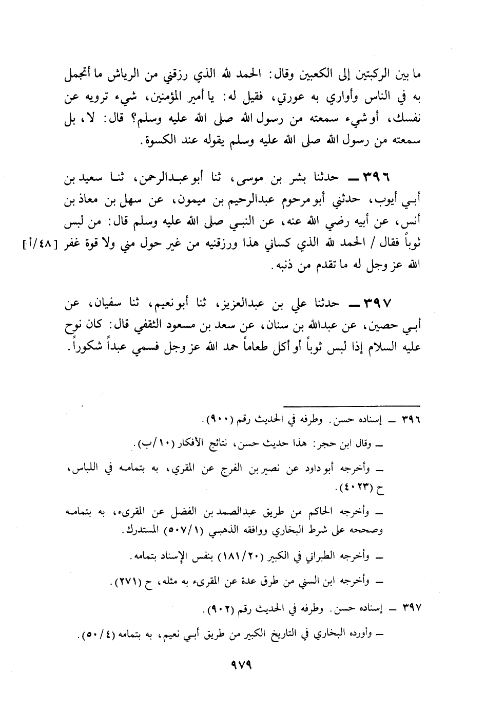 396- حَدَّثَنَا بِشْرُ بْنُ مُوسَى، حَدَّثَنَا أَبُو عَبْدِ الرَّحْمَنِ، حَدَّثَنَا سَعِيدُ بْنُ أَبِي أَيُّوبَ، حَدَّثَنِي أَبُو مَرْحُومٍ عَبْدُ الرَّحِيمِ بْنُ مَيْمُونٍ، عَنْ سَهْلِ بْنِ مُعَاذِ بْنِ أَنَسٍ، عَنْ أَبِيهِ، رَضِيَ اللَّهُ عَنْهُ, عَنِ النَّبِيِّ صَلى الله عَلَيه وَسَلم قَالَ: مَنْ لَبِسَ ثَوْبًا, فَقَالَ: الْحَمْدُ لِلَّهِ الَّذِي كَسَانِي هَذَا, وَرَزَقَنِيهِ مِنْ غَيْرِ حَوْلٍ مِنِّي وَلاَ قُوَّةٍ, غَفَرَ اللَّهُ عَزَّ وَجَلَّ لَهُ مَا تَقَدَّمَ مِنْ ذَنْبِهِ.