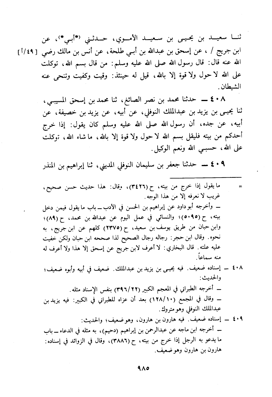 408- حَدَّثَنَا مُحَمَّدُ بْنُ نَصْرٍ الصَّائِغُ، حَدَّثَنَا مُحَمَّدُ بْنُ إِسْحَاقَ الْمُسَيَّبِيُّ، حَدَّثَنَا يَحْيَى بْنُ يَزِيدَ بْنِ عَبْدِ الْمَلِكِ النَّوْفَلِيُّ، عَنْ أَبِيهِ، عَنْ يَزِيدَ بْنِ خُصَيْفَةَ، عَنْ أَبِيهِ، عَنْ جَدِّهِ، أَنَّ رَسُولَ اللهِ صَلى الله عَلَيه وَسَلم كَانَ يَقُولُ: إِذَا خَرَجَ أَحَدُكُمْ مِنْ بَيْتِهِ فَلْيَقُلْ: بِسْمِ اللهِ لاَ حَوْلَ وَلاَ قُوَّةَ إِلاَّ بِاللهِ, مَا شَاءَ اللَّهُ، تَوَكَّلْتُ عَلَى اللهِ، حَسْبِيَ اللَّهُ وَنِعْمَ الْوَكِيلُ.