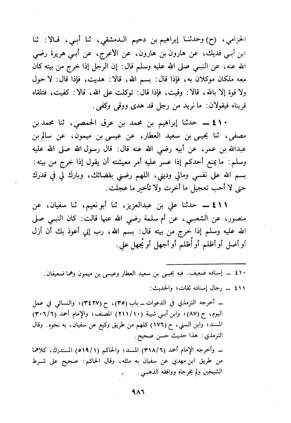 411- حَدَّثَنَا عَلِيُّ بْنُ عَبْدِ الْعَزِيزِ، حَدَّثَنَا أَبُو نُعَيْمٍ، حَدَّثَنَا سُفْيَانُ، عَنْ مَنْصُورٍ، عَنِ الشَّعْبِيِّ، عَنْ أُمِّ سَلَمَةَ، رَضِيَ اللَّهُ عَنْهَا قَالَتْ: كَانَ النَّبِيُّ صَلى الله عَلَيه وَسَلم إِذَا خَرَجَ مِنْ بَيْتِهِ قَالَ: بِسْمِ اللهِ، رَبِّ إِنِّي أَعُوذُ بِكَ أَنْ أَزِلَّ, أَوْ أَضِلَّ, أَوْ أَظْلِمَ, أَوْ أُظْلَمَ, أَوْ أَجْهَلَ, أَوْ يُجْهَلَ عَلَيَّ.