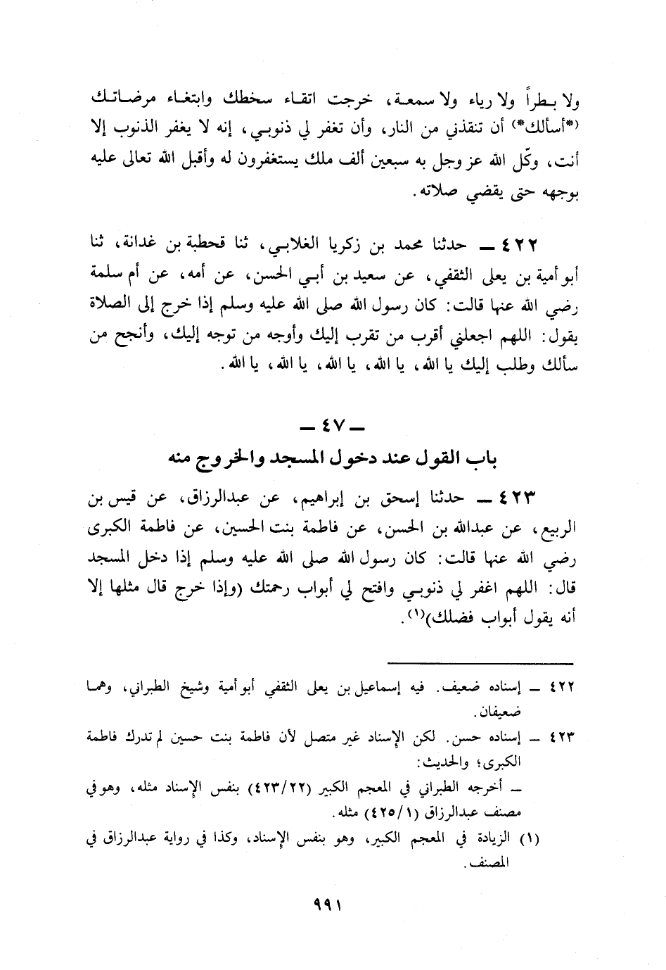 423- حَدَّثَنَا إِسْحَاقُ بْنُ إِبْرَاهِيمَ، عَنْ عَبْدِ الرَّزَّاقِ، عَنْ قَيْسِ بْنِ الرَّبِيعِ، عَنْ عَبْدِ اللهِ بْنِ الْحَسَنِ، عَنْ فَاطِمَةَ بِنْتِ الْحُسَيْنِ، عَنْ فَاطِمَةَ الْكُبْرَى، رَضِيَ اللَّهُ عَنْهَا قَالَتْ: كَانَ رَسُولُ اللهِ صَلى الله عَلَيه وَسَلم إِذَا دَخَلَ الْمَسْجِدَ قَالَ: اللَّهُمَّ اغْفِرْ لِي ذُنُوبِي وَافْتَحْ لِي أَبْوَابَ رَحْمَتِكَ, وَإِذَا خَرَجَ قَالَ مِثْلَهَا, إِلاَّ أَنَّهُ يَقُولُ: أَبْوَابَ فَضْلِكَ.