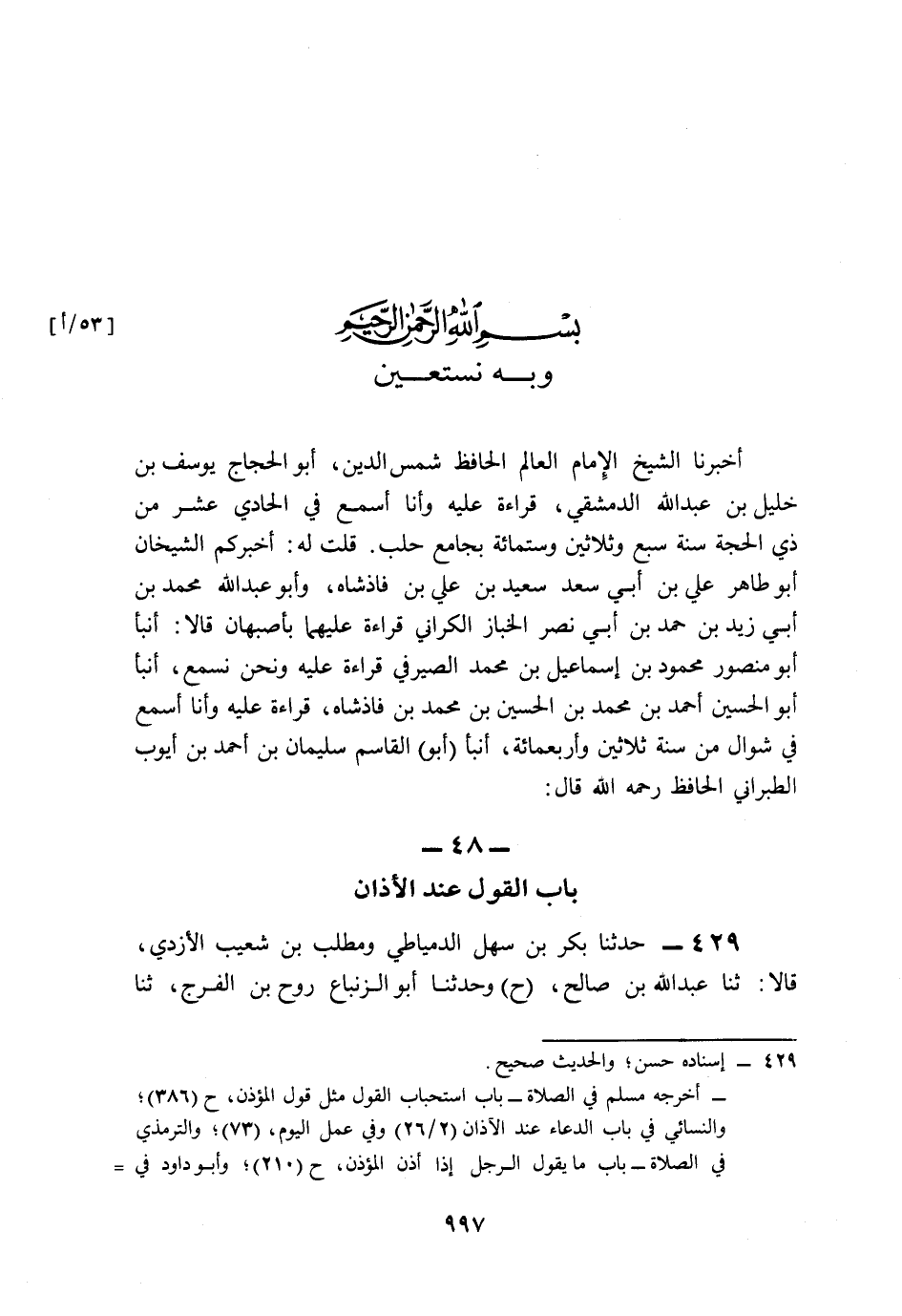 - أَخْبَرَنَا الشَّيْخُ الإِمَامُ الْعَالِمُ الْحَافِظُ شَمْسُ الدِّينِ, أَبُو الْحَجَّاجِ يُوسُفُ بْنُ خَلِيلِ بْنِ عَبْدِ اللهِ الدِّمَشْقِيُّ قِرَاءَةً عَلَيْهِ وَأَنَا أَسْمَعُ, فِي الْحَادِي عَشَرَ مِنْ ذِي الْحِجَّةِ, سَنَةَ سَبْعٍ وَثَلاَثِينَ وَسِتِّمِئَةٍ بِجَامِعِ حَلَبَ, قُلْتُ لَهُ: أَخْبَرَكُمُ الشَّيْخَانِ أَبُو طَاهِرٍ عَلِيُّ بْنُ أَبِي سَعْدٍ سَعِيدُ بْنُ عَلِيِّ بْنِ فَاذَشَاهْ، وَأَبُو عَبْدِ اللهِ مُحَمَّدُ بْنُ أَبِي زَيْدِ بْنِ حَمَدِ بْنِ أَبِي نَصْرٍ الْخَبَّازُ الْكُرَانِيُّ قِرَاءَةً عَلَيْهِمَا بِأَصْبَهَانَ, قَالاَ: أَخْبَرَنَا أَبُو مَنْصُورٍ مَحْمُودُ بْنُ إِسْمَاعِيلَ بْنِ مُحَمَّدٍ الصَّيْرَفِيُّ قِرَاءَةً عَلَيْهِ وَنَحْنُ نَسْمَعُ، أَخْبَرَنَا أَبُو الْحُسَيْنِ أَحْمَدُ بْنُ مُحَمَّدِ بْنِ الْحُسَيْنِ بْنِ مُحَمَّدِ بْنِ فَاذَشَاهْ قِرَاءَةً عَلَيْهِ وَأَنَا أَسْمَعُ, فِي شَوَّالٍ مِنْ سَنَةِ ثَلاثِينَ وَأَرْبَعِمِئَةٍ، أَخْبَرَنَا أَبُو الْقَاسِمِ سُلَيْمَانُ بْنُ أَحْمَدَ بْنِ أَيُّوبَ الطَّبَرَانِيُّ الْحَافِظُ رَحِمَهُ اللَّهُ قَالَ: