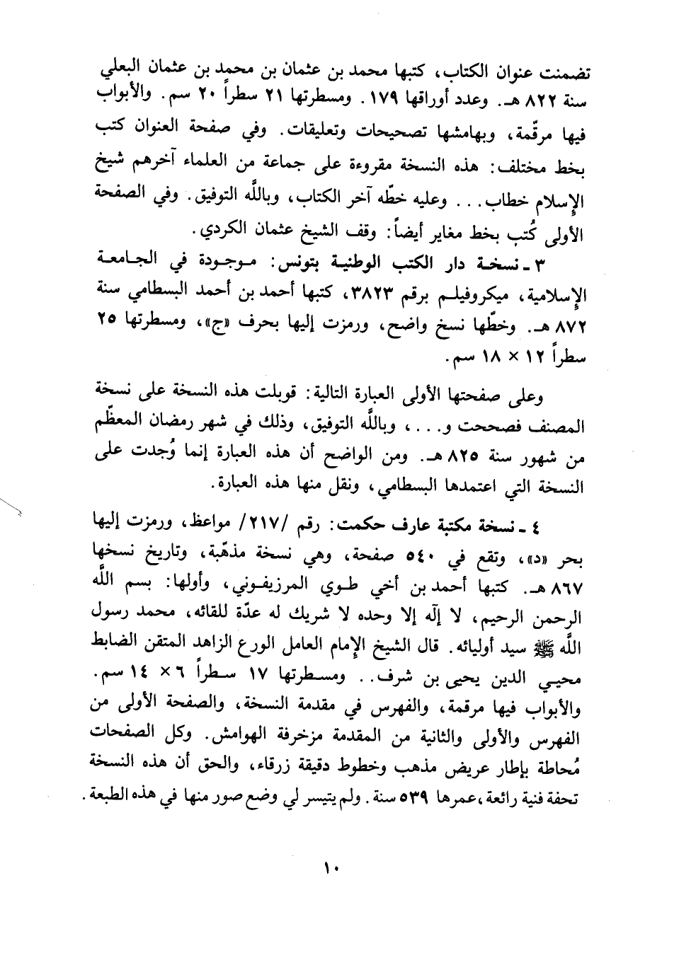 3 - نسخة دار الكتب الوطنية بتونس: موجودة في الجامعة الإِسلامية، ميكروفيلم برقم 3823، كتبها أحمد بن أحمد البسطامي سنة 872 هـ. وخطّها نسخ واضح، ورمزت إليها بحرف "ج"، ومسطرتها 25 سطرًا 12 × 18 سم.
