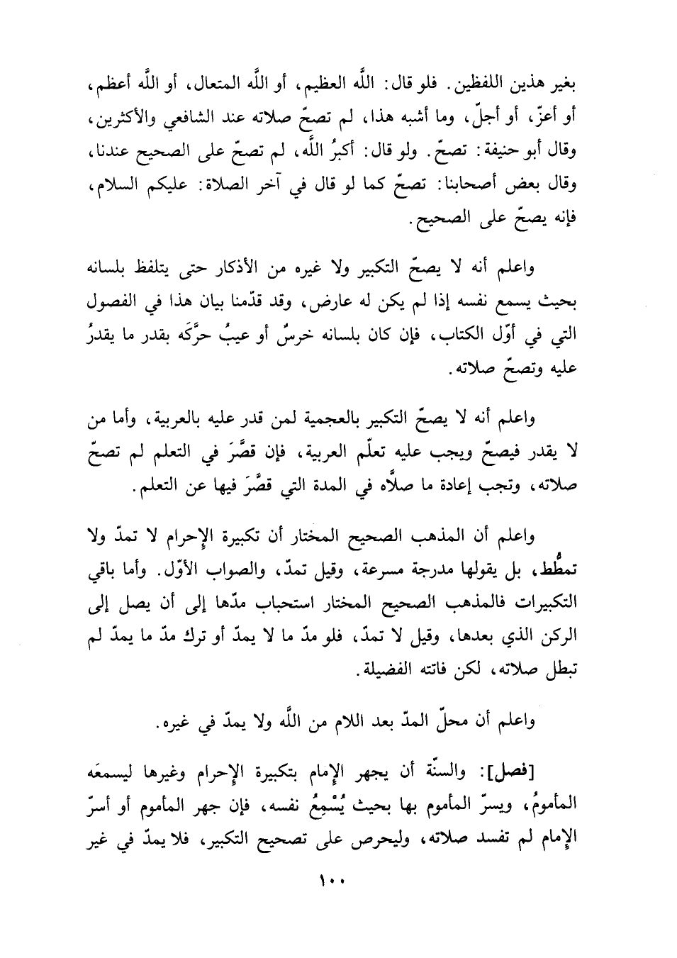[فصل]: والسنّة أنَّ يجهر الإِمام بتكبيرة الإِحرام وغيرها ليسمعَه المأمومُ، ويسرّ المأموم بها بحيث يُسْمِعُ نفسه، فإن جهر المأموم أو أسرّ الإِمام لم تفسد صلاته، وليحرص على تصحيح التكبير، فلا يمدّ في غير