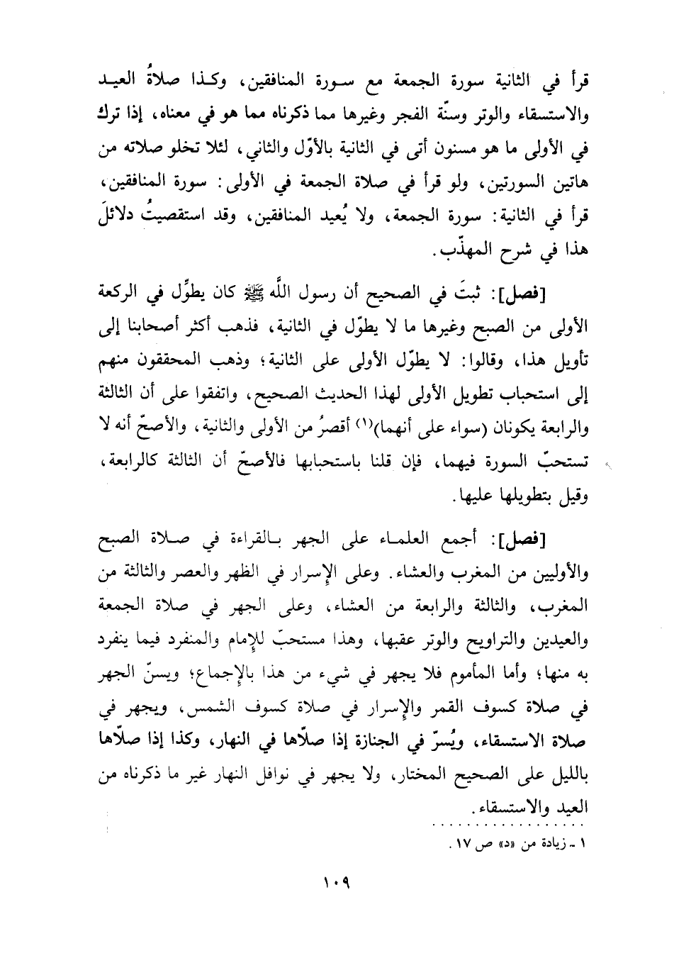 قرأ في الثانية سورة الجمعة مع سورة المنافقين، وكذا صلاةُ العيد والاستسقاء والوتر وسنّة الفجر وغيرها مما ذكرناه مما هو في معناه، إذا ترك في الأولى ما هو مسنون أتى في الثانية بالأوّل والثاني، لئلا تخلو صلاته من هاتين السورتين، ولو قرأ في صلاة الجمعة في الأولى: سورة المنافقين، قرأ في الثانية: سورة الجمعة، ولا يُعيد المنافقين، وقد استقصيتُ دلائلَ هذا في شرح المهذّب.
