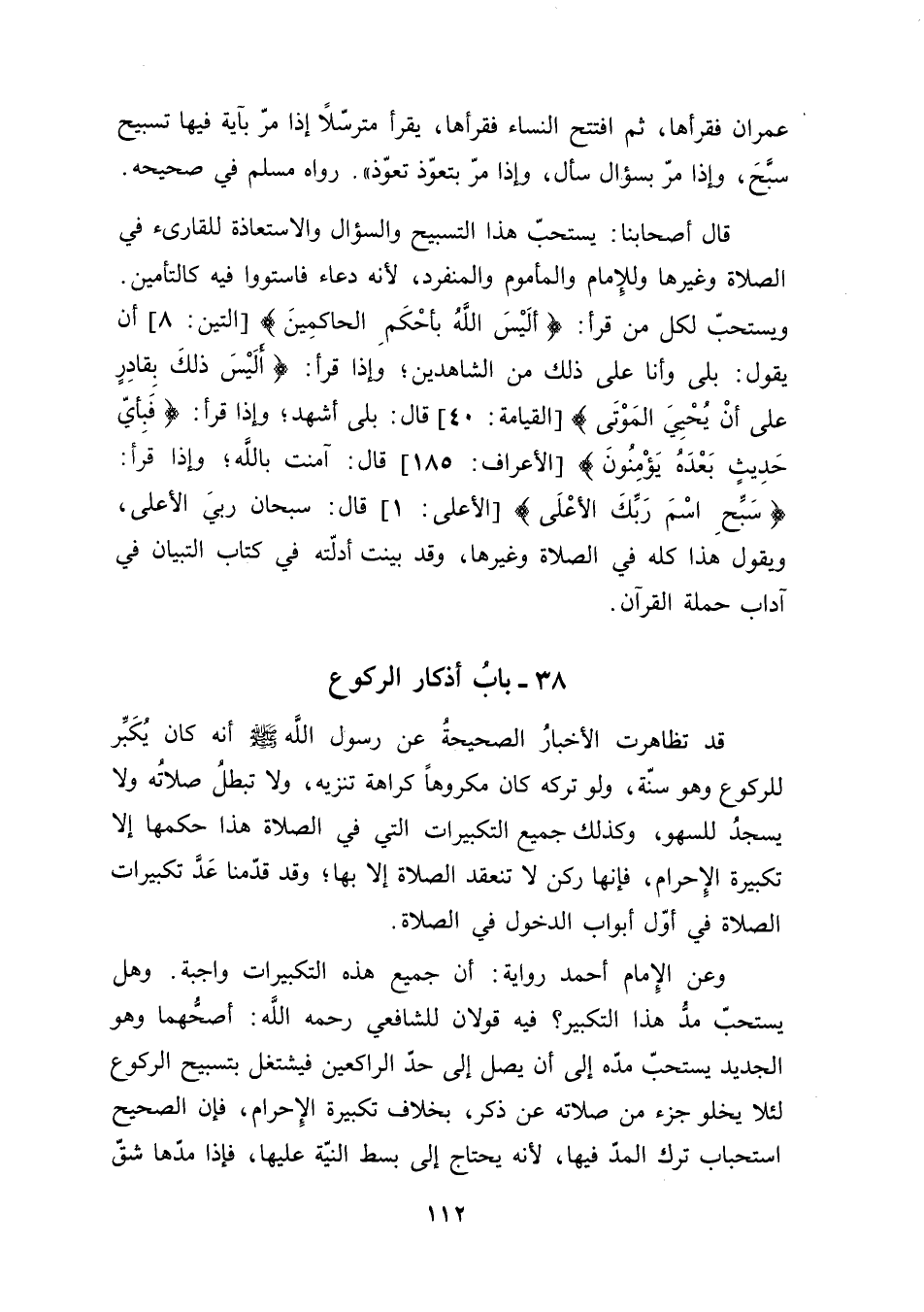 قال أصحابنا: يستحبّ هذا التسبيح والسؤال والاستعاذة للقارىء في الصلاة وغيرها وللإِمام والمأموم والمنفرد، لأنه دعاء فاستووا فيه كالتأمين. ويستحبّ لكل من قرأ: {ألَيْسَ اللَّهُ بأحْكَمِ الحاكِمِينَ} [التين:8] أن يقول: بلى وأنا على ذلك من الشاهدين؛ وإذا قرأ: {أَلَيْسَ ذلكَ بِقادِرٍ على أنْ يُحْيِيَ المَوْتَى} [القيامة:40] قال: بلى أشهد؛ وإذا قرأ: {فَبِأيّ حَدِيثٍ بَعْدَهُ يؤْمِنُونَ} [الأعراف:185] قال: آمنت بالله؛ وإذا قرأ: {سَبِّحِ اسْمَ رَبِّكَ الأعْلَى} [الأعلى:1] قال: سبحان ربي الأعلى، ويقول هذا كله في الصلاة وغيرها، وقد بينت أدلته في كتاب "التبيان في آداب حملة القرآن".