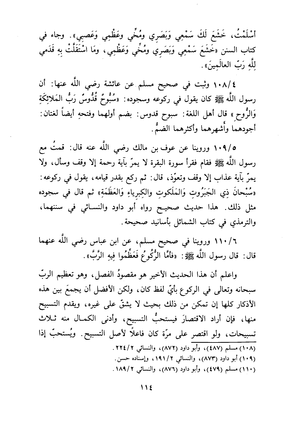 أن رسول الله صلى الله عليه وسلم كان يقول في ركوعه وسجوده: "سُبُّوحٌ قُدُّوسٌ رَبُّ المَلائِكَةِ والرُّوحِ" قال أهل اللغة: سبوح قدوس: بضم أولهما وفتحهِ أيضًا لغتان: أجودهما وأشهرهما وأكثرهما الضمُّ.