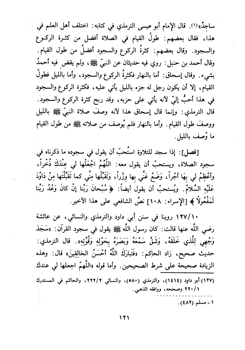 ساجدٌ" (¬1). قال الإِمام أبو عيسى الترمذي في كتابه: اختلف أهل العلم في هذا، فقال بعضهم: طولُ القيام في الصلاة أفضل من كثرة الركوع والسجود. وقال بعضهم: كثرةُ الركوع والسجود أفضلُ من طول القيام. وقال أحمد بن حنبل: روي فيه حديثان عن النبيّ صلى الله عليه وسلم، ولم يقضِ فيه أحمدُ بشيء. وقال إسحاق: أما بالنهار فكثرةُ الركوع والسجود، وأما بالليل فطولُ القيام، إلا أن يكون رجل له جزء بالليل يأتي عليه، فكثرة الركوع والسجود في هذا أحبُّ إليّ لأنه يأتي على حزبه، وقد ربح كثرة الركوع والسجود. قال الترمذي: وإنما قال إسحاق هذا لأنه وصفَ صلاة النبيّ صلى الله عليه وسلم بالليل ووصفَ طول القيام. وأما بالنهار فلم يُوصف من صلاته صلى الله عليه وسلم من طول القيام ما وُصف بالليل.