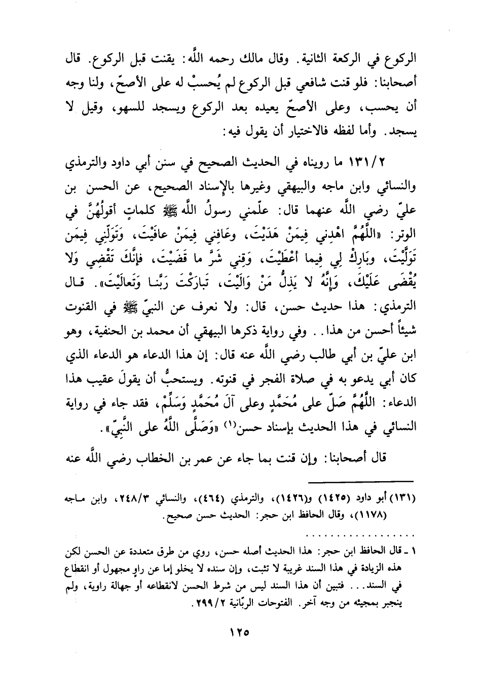 علّمني رسولُ الله صلى الله عليه وسلم كلماتٍ أقولُهُنَّ في الوتر: "اللَّهُمَّ اهْدِني فِيمَنْ هَدَيْتَ، وعَافِني فِيمَنْ عَافَيْتَ، وَتَوَلّني فِيمَن تَوَلَّيْتَ، وبَارِكْ لِي فِيما أَعْطَيْتَ، وَقِني شَرَّ ما قَضَيْتَ، فإنَّكَ تَقْضِي وَلا يُقْضَى عَلَيْكَ، وَإِنَّهُ لا يَذِلُّ مَنْ وَالَيْتَ، تَبَارَكْتَ رَبَّنا وَتَعالَيْتَ". قال الترمذي: هذا حديث حسن، قال: ولا نعرف عن النبيّ صلى الله عليه وسلم في القنوت شيئًا أحسن من هذا. وفي رواية ذكرها البيهقي أن محمد بن الحنفية، وهو ابن علي بن أبي طالب رضي الله عنه قال: إن هذا الدعاء هو الدعاء الذي كان أبي يدعو به في صلاة الفجر في قنوته. ويستحبُّ أن يقولَ عقيب هذا الدعاء: اللَّهُمَّ صَلّ على مُحَمَّدٍ وعلى آلِ مُحَمَّدٍ وَسَلِّم، فقد جاء في رواية النسائي في هذا الحديث بإسناد حسن (¬1) "وَصَلَى اللَّهُ على النَّبِيّ".