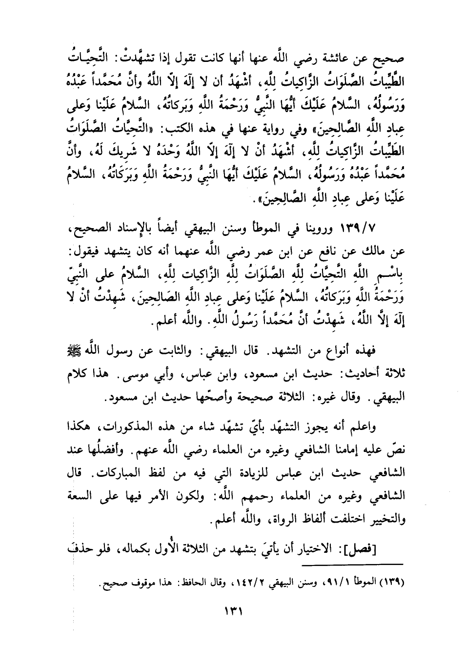 فهذه أنواع من التشهد. قال البيهقي: والثابت عن رسول الله صلى الله عليه وسلم ثلاثة أحاديث: حديث ابن مسعود، وابن عباس، وأبي موسى. هذا كلام البيهقي. وقال غيره: الثلاثة صحيحة وأصحّها حديث ابن مسعود.