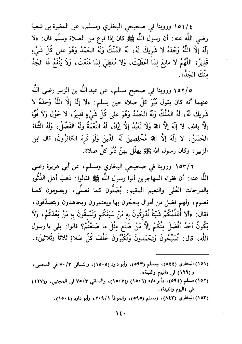 أنه كان يقول دُبُرَ كلّ صلاة حين يسلم: "لا إلهَ إِلاَّ اللَّهُ وَحدَهُ لا شَريكَ لَهُ، لَهُ المُلْكُ وَلَهُ الحَمْدُ وَهُوَ عَلَة كُلّ شَيْءٍ قَدِيرٌ، لا حَوْلَ وَلاَ قُوَّةَ إِلاَّ بالله، لا إِلهَ إِلاَّ الله وَلاَ نَعْبُدُ إِلاَّ إيَّاهُ، لَهُ النِّعْمَةُ ولَهُ الفَضْلُ، وَلَهُ الثَّناءُ الحَسَنُ، لا إلهَ إِلاَّ الله مُخْلِصِينَ لَهُ الدِّينَ وَلَوْ كَرِهَ الكافِرُونَ" قال ابن الزبير: وكان رسول الله صلى الله عليه وسلم يهلّل بهنّ دُبُرَ كُلِّ صلاة.