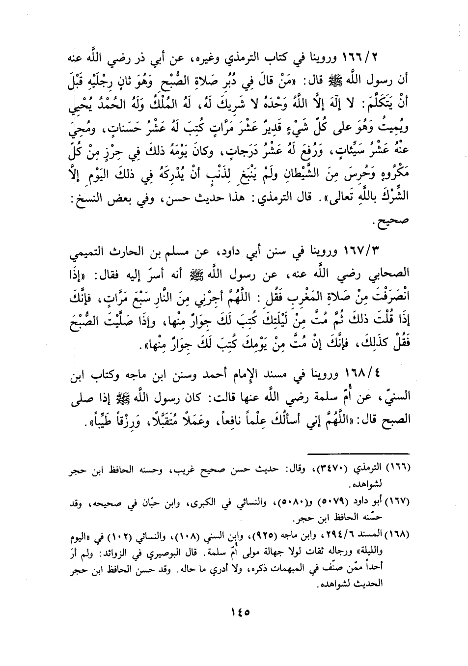 أن رسول الله صلى الله عليه وسلم قال: "مَنْ قالَ فِي دُبُرِ صَلاةِ الصُّبْحِ وَهُوَ ثانٍ رِجْلَيهِ قَبْلَ أنْ يَتَكَلَّمَ: لا إِلهَ إِلاَّ اللَّهُ وَحْدَهُ لاَ شَرِيكَ لَهُ، لَهُ المُلْكُ وَلَهُ الحَمْدُ يُحْيي وَيُمِيتُ وَهُوَ على كُلّ شَيْءٍ قَدِيرٌ عَشْرَ مرَّاتٍ كُتِبَ لَهُ عَشْرُ حَسَناتٍ، ومُحِيَ عَنْهُ عَشْرُ سَيِّئاتٍ، وَرُفِعَ لَهُ عَشْرُ دَرَجاتٍ، وكانَ يَوْمَهُ ذلكَ فِي حِرْزٍ مِنْ كُلّ مَكْرُوهٍ وَحُرِسَ مِنَ الشَّيْطانِ ولَمْ يَنْبَغِ لِذَنْبٍ أنْ يُدْرِكَهُ في ذلكَ اليَوْمِ إِلاَّ الشِّرْكَ باللَّهِ تَعالى". قال الترمذي: هذا حديث حسن، وفي بعض النسخ: صحيح.